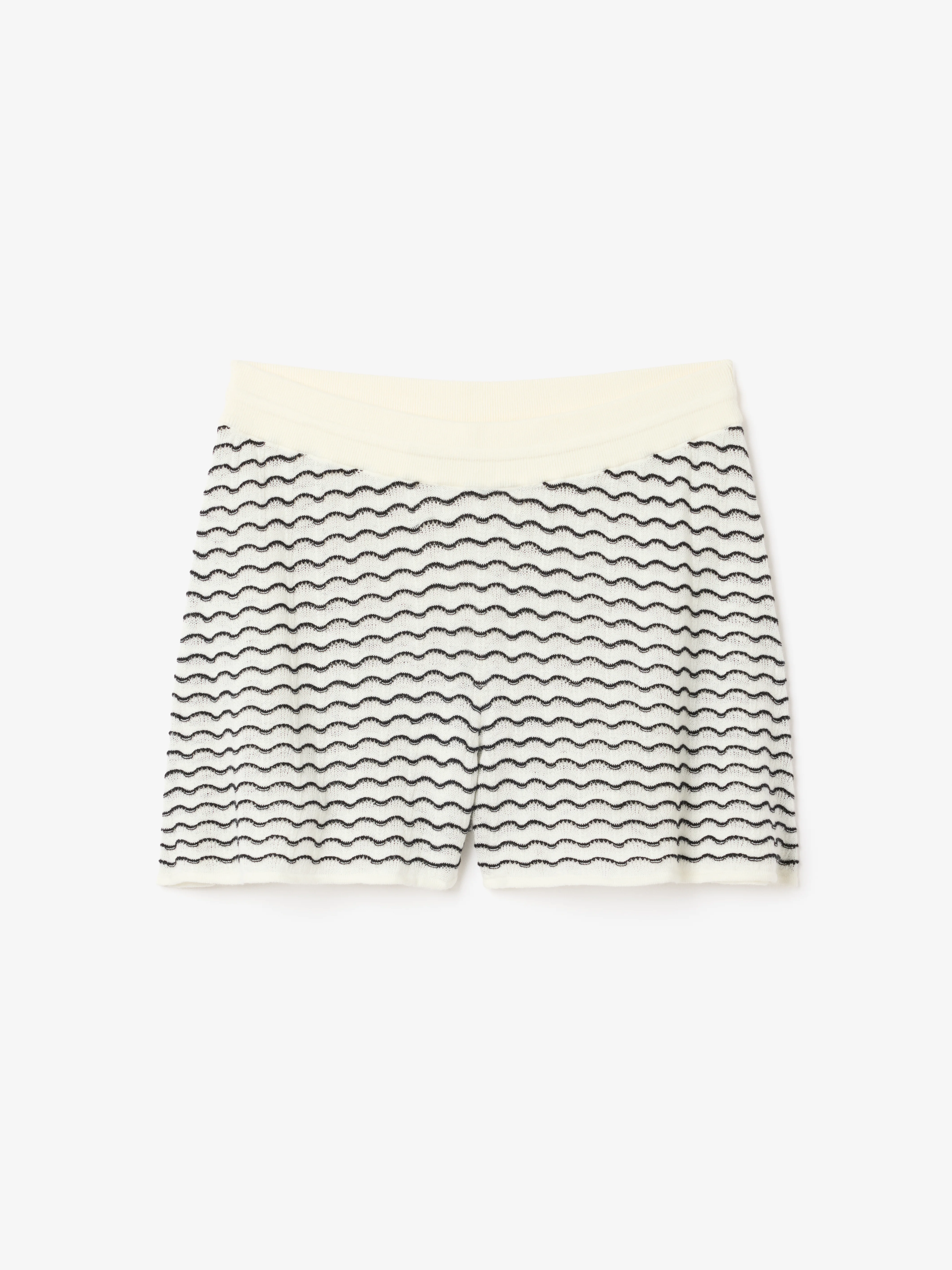 Mid-waist pull-on shorts in black-and-white silk-blend lace knit with an easy, lightweight feel. Shaped by a knitted waistband and finished with an artful lace motif developed by Dagmar’s in-house knitting atelier. MATERIAL 70% Organic cotton 20% Recycled nylon 10% Silk GARMENT ORIGIN Produced in Hong Kong SAR China