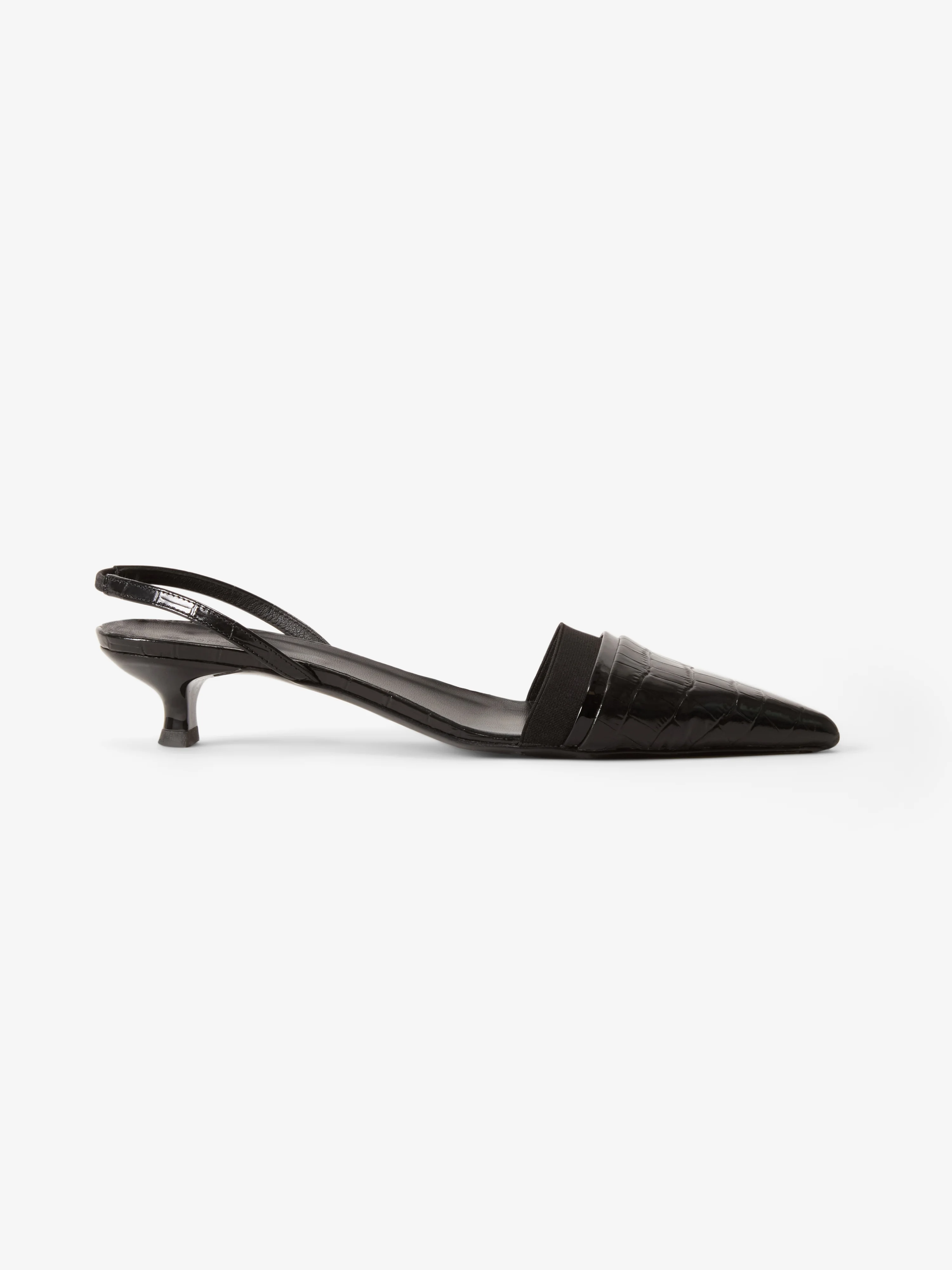 A demi-heel silhouette featuring a sleek pointed toe, elastic slingback straps and a refined contrast of textures. The base is crafted from croco-embossed calf leather, while the trim is finished in lustrous patent leather. FIT & SIZING True to size GARMENT ORIGIN Produced in Italy