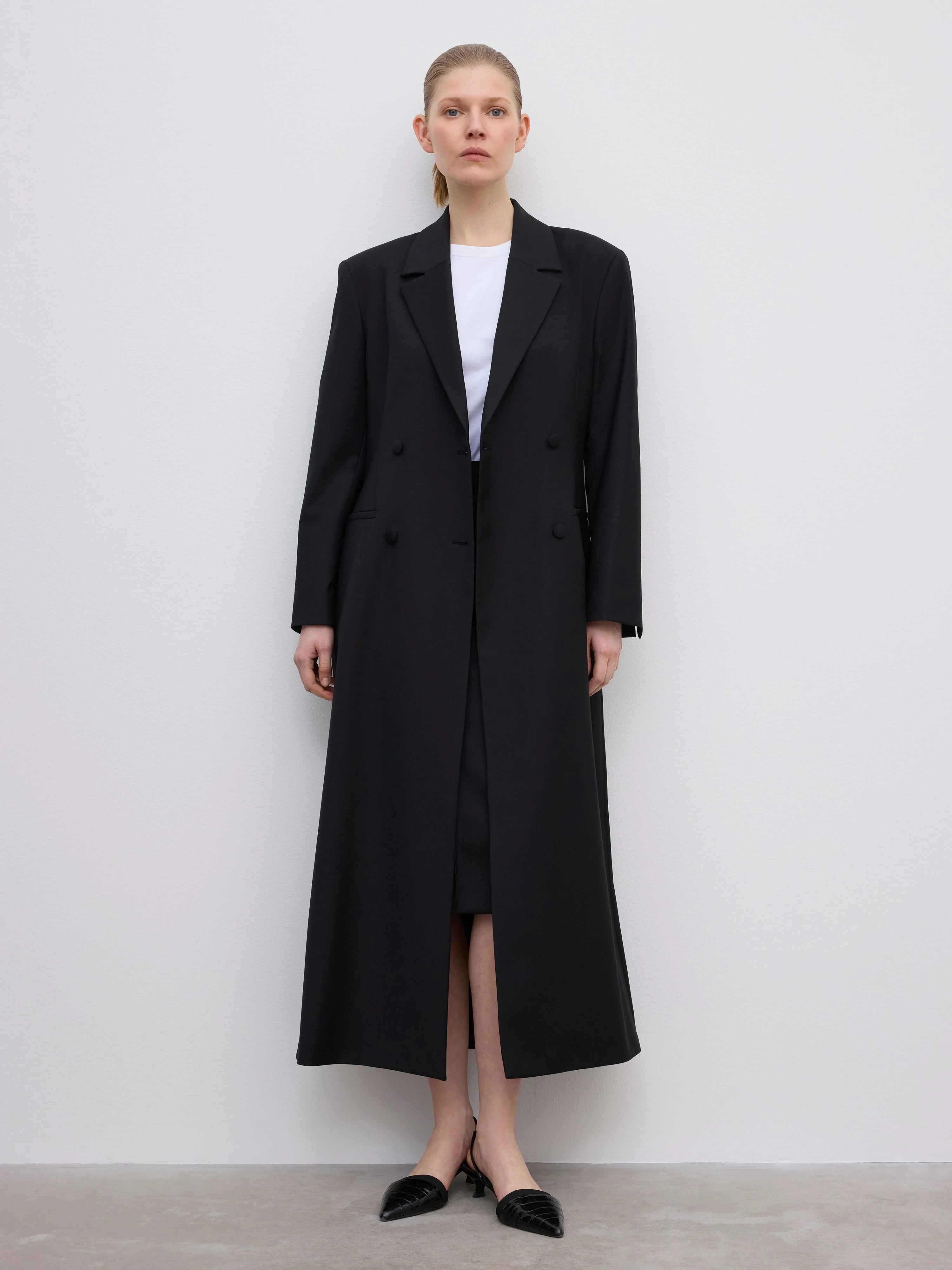 A double-breasted coat in lightweight wool suiting with a sharply tailored, elongated look. Presented with a high slit at the back, front welt pockets and fabric-covered buttons. Fully lined. FIT & SIZING Model is 175cm/ 5'7" and is wearing a size 36, UK 8, US 4. MATERIAL 54% Recycled polyester, 44% Virgin wool, 2% Elastane. GARMENT CARE Dry Clean Only GARMENT ORIGIN Produced in Portugal