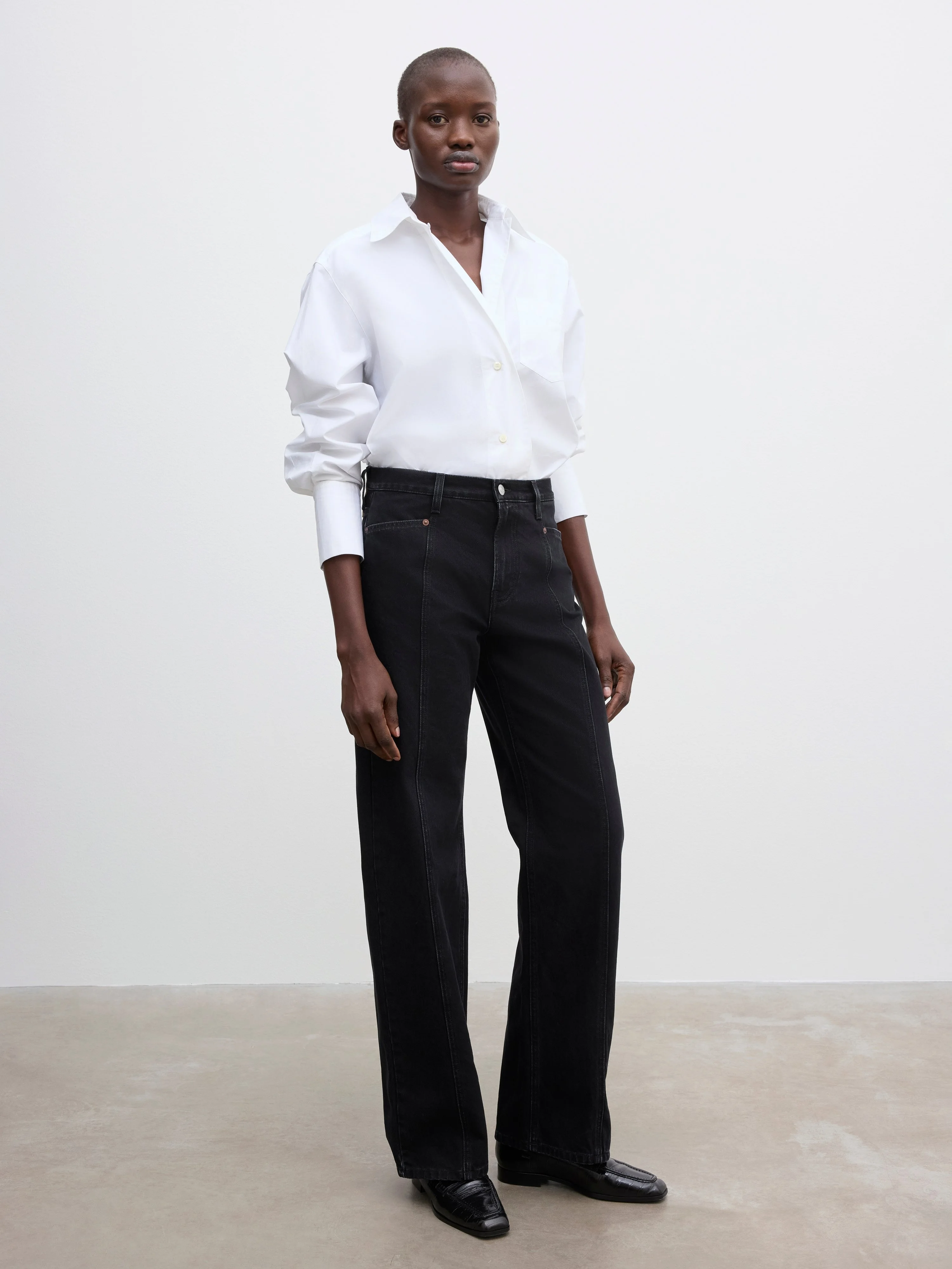 A mid-rise jean in 100% organic cotton with a straight, wide-leg frame and top-stitch detailing to the front. Made in Italy. Oversized in fit, many choose to size down one size. - Organic cotton - 5 pocket denim construction - Mid rise - Loose fit - Straight leg - Zip fly - Italian fabric - Made in Italy - Model is 178cm/ 5'8" and is wearing a size 27/34 - Oversized in fit, many choose to size down one size FIT & SIZING Model is 178 cm/ 5'8" and is wearing a size 27/34 MATERIAL 100% Organic cotton GARMENT CARE Machine wash 30° GARMENT ORIGIN Produced in Italy