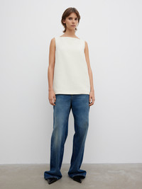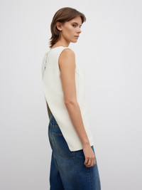 Textured tailored top made from a cotton blend boucle with a square neckline, sensual, open back, elongated hemline and covered button closures at the neck. Fully lined. FIT & SIZING Model is 176 cm / 5'7" and is wearing a size 36, UK 8, US 4. MATERIAL 62% Polyester 20% Cotton, 17% Viscose, 1% Elastane GARMENT CARE Dry Clean GARMENT ORIGIN Produced in Portugal