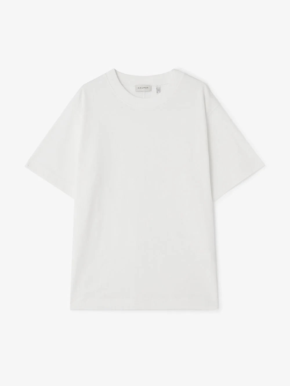 Consciously crafted from our heavyweight organic cotton jersey, the Oversized Cotton Tee is a loose-fitting short-sleeved t-shirt and the perfect foundation piece. Relaxed yet refined, it is cut to a straight silhouette featuring dropped shoulders, tonal topstitching center back, and an embroidered tonal DAGMAR logo. FIT & SIZING Model is 176 cm / 5'7" and is wearing a size S, UK 8, US 4. MATERIAL 100% Organic Cotton. GARMENT CARE 30°C Machine Wash Delicate GARMENT ORIGIN Produced in Portugal