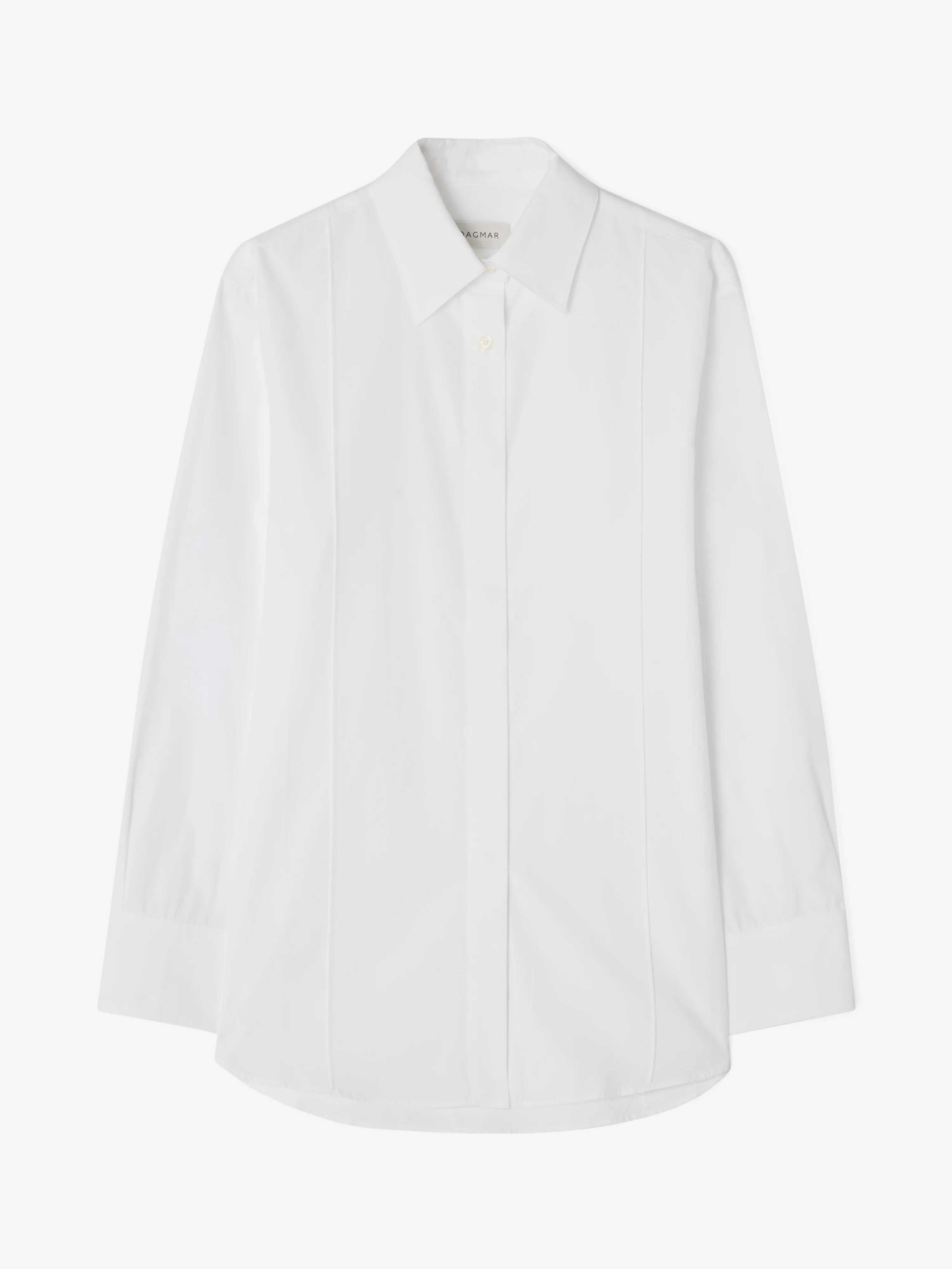 Slim button-up shirt in crisp organic cotton poplin with an elongated rounded hem, front patch pocket, and pin tuck detailing running down the front and back. Covered placket with an accenting DAGMAR monogram. FIT & SIZING Model is 176 cm / 5'7" and is wearing a size 36, UK 8, US 4. MATERIAL 100% Organic cotton GARMENT CARE Machine wash, 30° delicate GARMENT ORIGIN Produced in Portugal
