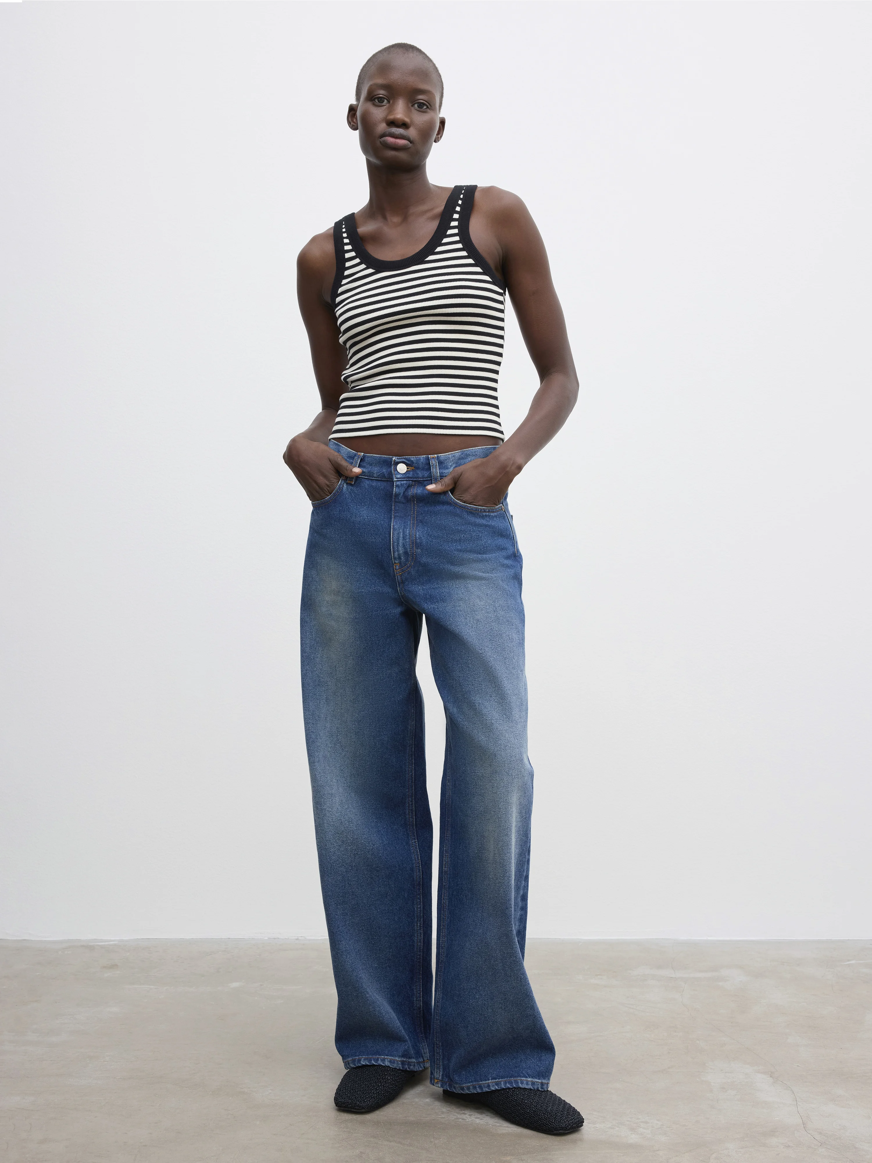 Slightly cropped tank top from an organic Italian cotton blend, with a graphic black and white stripe pattern. Complete with a scoop neck, black bindings and an embroidered Dagmar logo at the back. FIT & SIZING Model is 178cm/ 5'8" and is wearing a size 36, UK 8, US 4. MATERIAL 97% Cotton 3% Elastane GARMENT ORIGIN Produced in Portugal