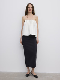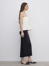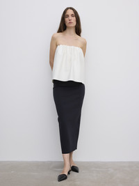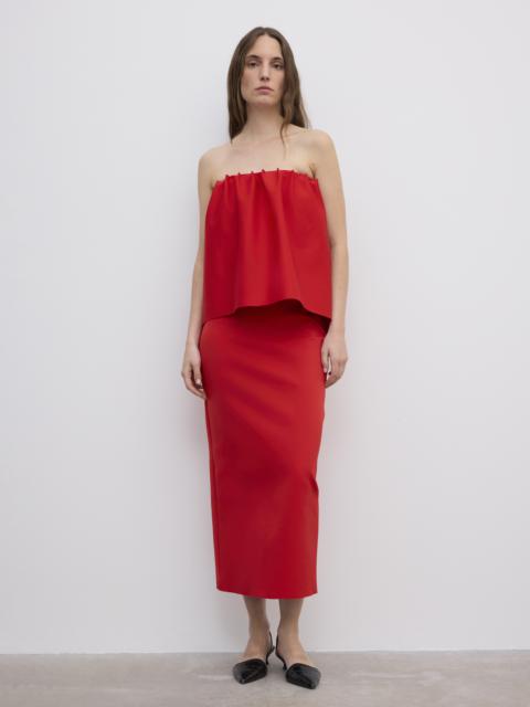 Rouched midi-dress in a sculptural polyamide blend, pairing soft front pleats with a slim-fitting, contrasting underdress and an elongated slanted hem that extends towards the back. Complete with a concealed zipper at the back. FIT & SIZING Model is 177 cm / 5'8" and is wearing a size 36, UK 8, US 4. MATERIAL 63% polyamide 22% recycled polyamide, 15% elastane GARMENT ORIGIN Produced in Portugal