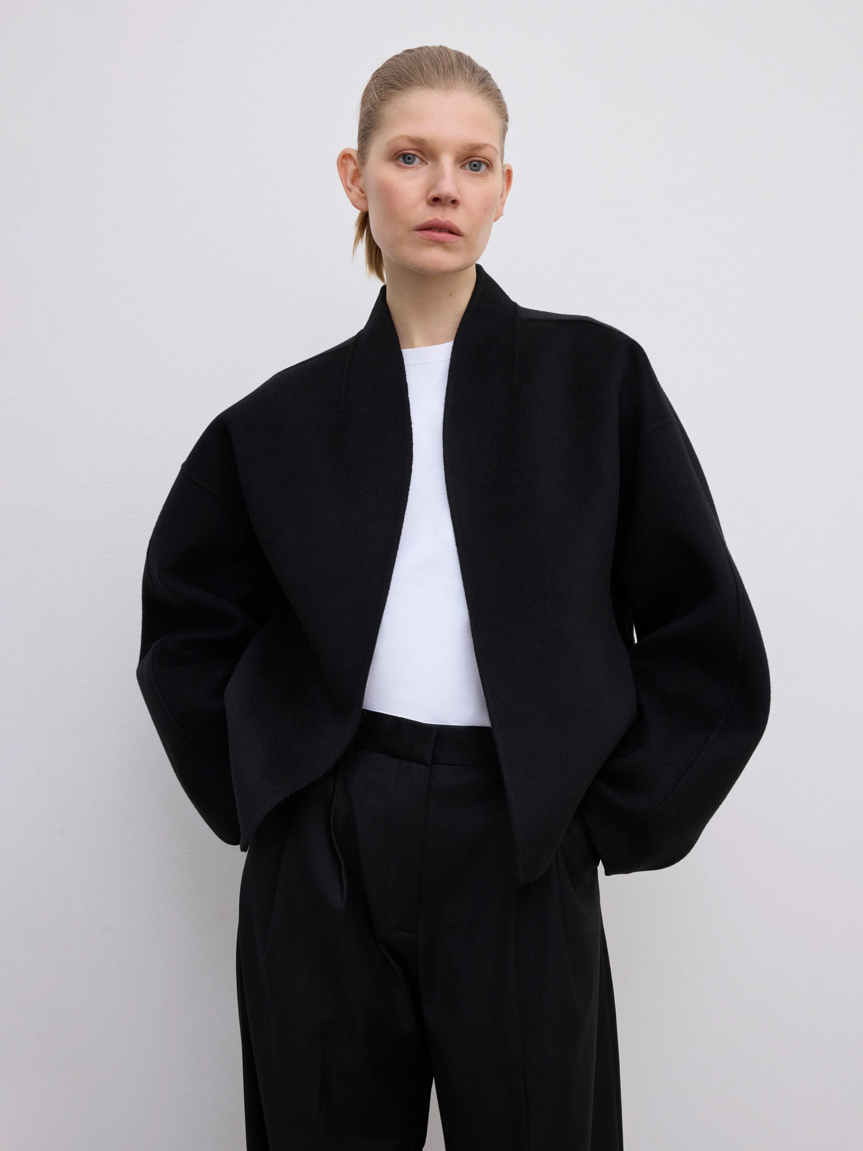 Short jacket made from luxurious wool double with a softly structured frame, rounded sleeves, dropped shoulders, and stand collar. Finished with in-seam pockets and accentuating seams. FIT & SIZING Model is 175cm/ 5'7" and is wearing a size 36, UK 8, US 4. If in between sizes, we recommend sizing down in this item MATERIAL 100% Mercerized wool. GARMENT CARE Dry Clean Only GARMENT ORIGIN Produced in China