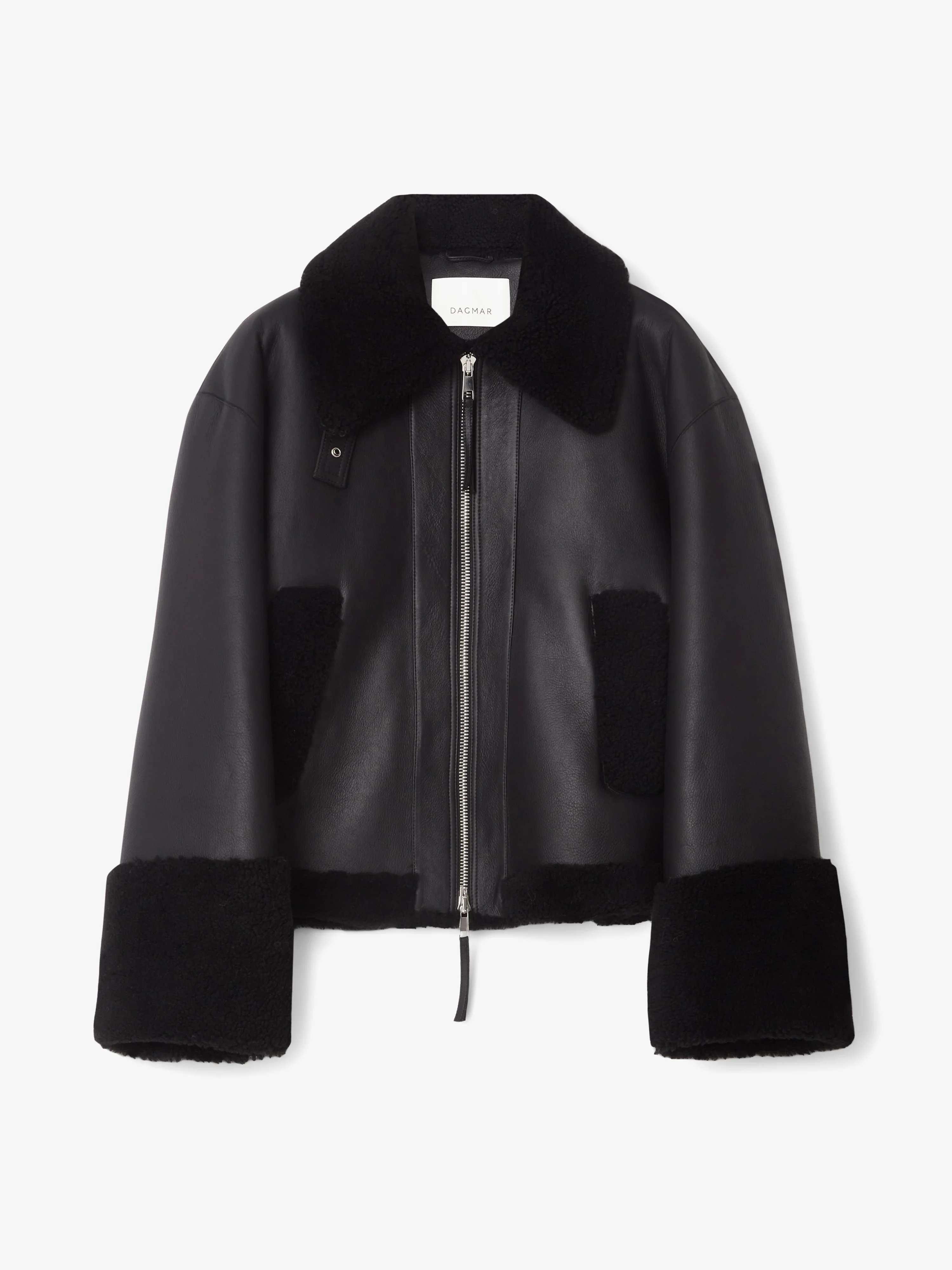 Crafted from our soft and warming luxurious shearling fur, the Short Shearling is an aviator jacket shaped to a straight and boxy fit. A contemporary play on a classic style, it falls mid-waist and features a high stand collar, extended foldable cuffs, and buckle detailing. Finishing touches include exposed shearling details at the back, hem, and side pockets. FIT & SIZING Model is 175cm/ 5'7" and is wearing a size 36, UK 8, US 4. MATERIAL 100% Lamb leather. GARMENT CARE Dry clean only by leather specialist. GARMENT ORIGIN Produced in Turkey