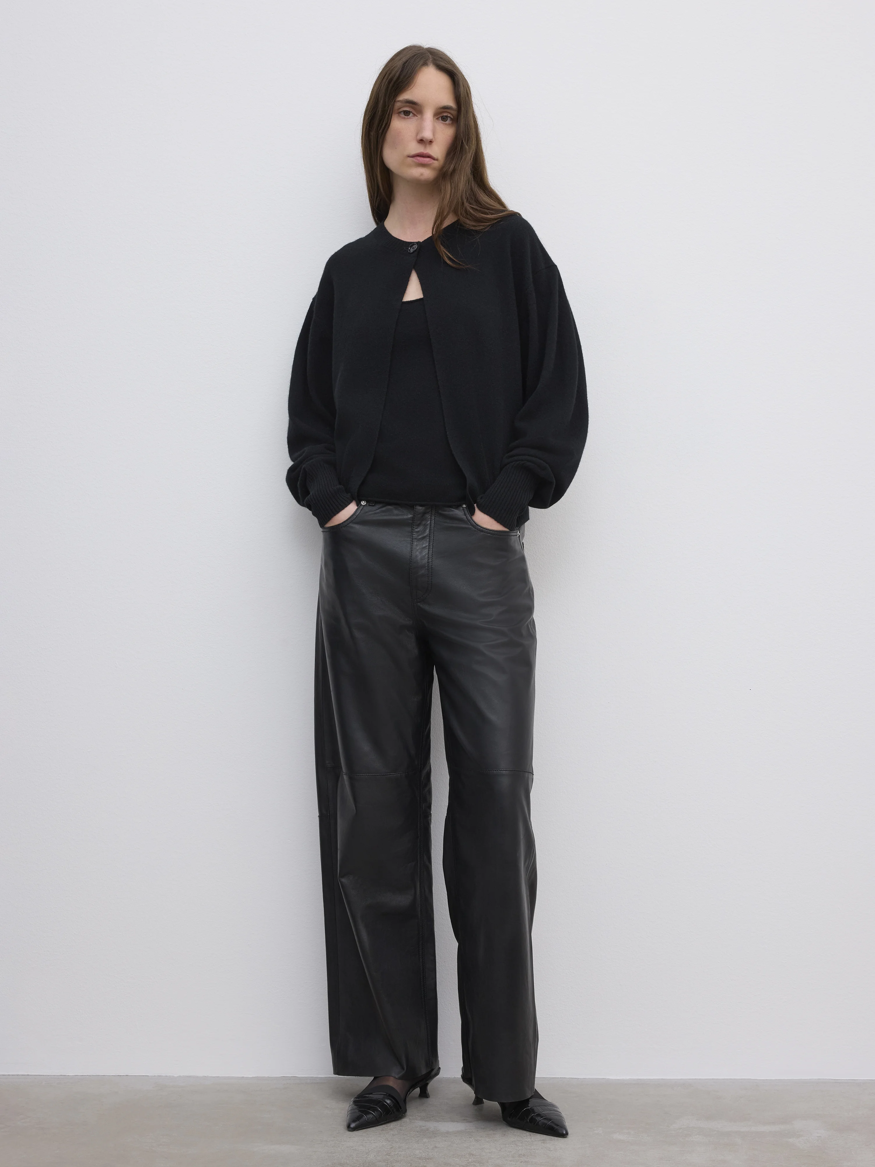 Crew neck cardigan in a soft cashmere and wool blend with a single button closure, dropped pleated shoulders, and ribbed trim at the neck, hem, and cuffs. FIT & SIZING Model is 176 cm/ 5'7" and is wearing a size S, UK 8, US 4. MATERIAL 70% Wool 30% Cashmere GARMENT CARE Handwash cold GARMENT ORIGIN Produced in China