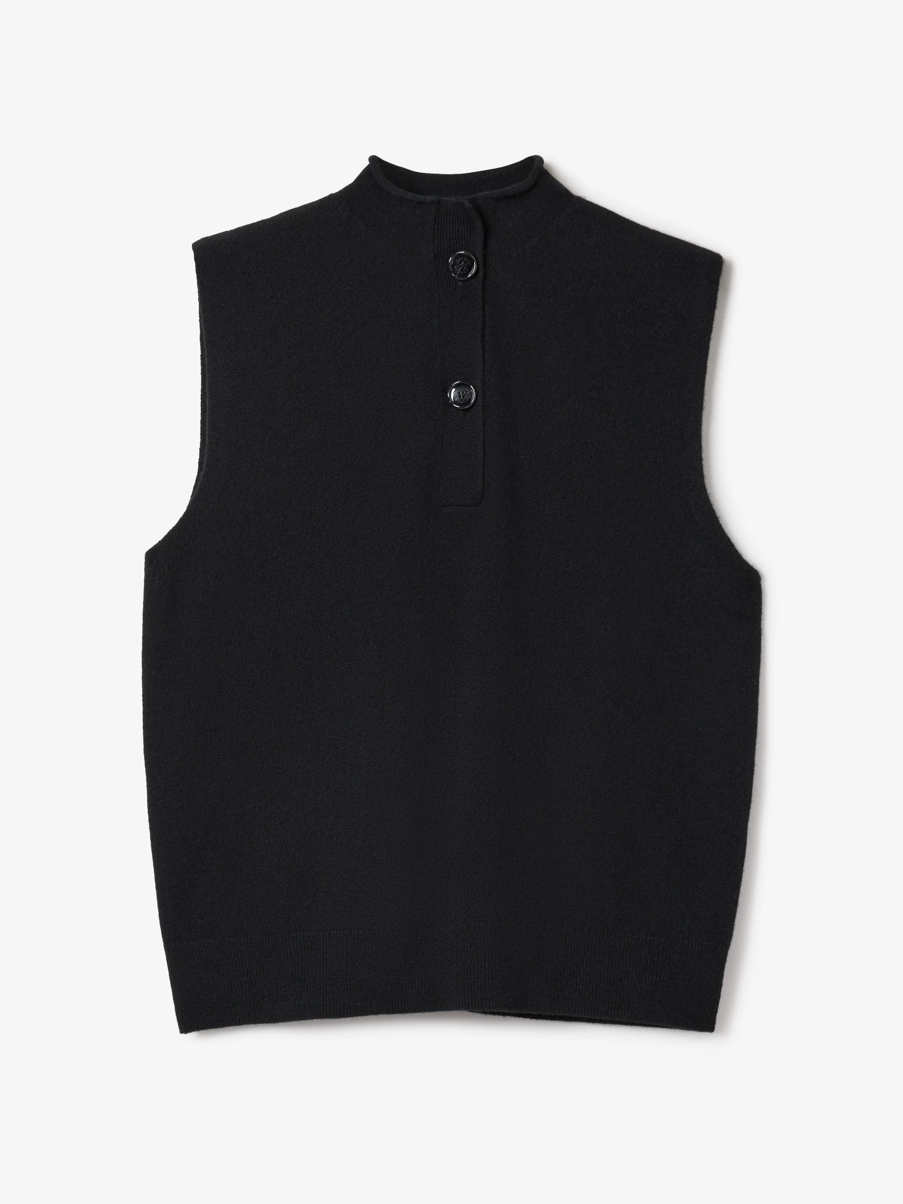 Sleeveless knit top in a soft cashmere blend with mock neck and shiny buttons with Dagmar logo. FIT & SIZING Model is 176 cm/ 5'7" and is wearing a size S, UK 8, US 4. MATERIAL 70% Wool 30% Cashmere GARMENT CARE Handwash cold GARMENT ORIGIN Produced in China