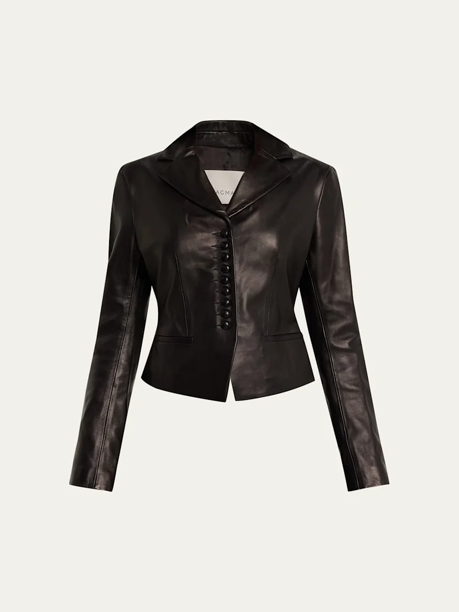 House of Dagmar ultrasmooth lambskin leather blazer finished with covered buttons for a refined silhouette. Notch lapels Singlebreasted front Long sleeves with button cuffs Welt pockets Slim fit Cutaway hem Buttonfront Leather Professional cleaning recommended Made in Portugal SIZE amp; FITModel measurements: 5'10" tall Model is wearing a US size 4/Small