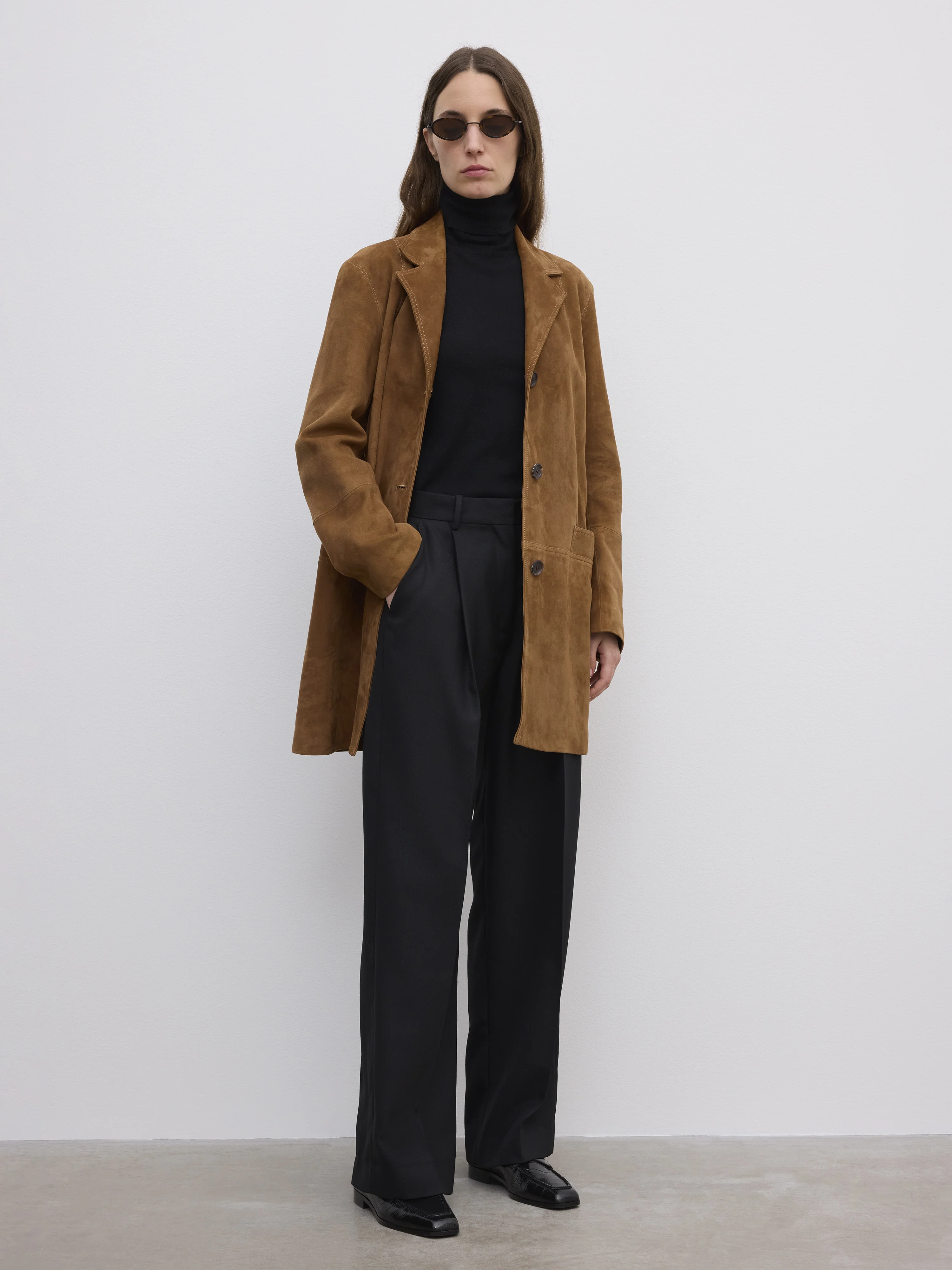 Single-breasted jacket in soft suede with a straight mid-thigh fit, notched lapels, and topstitch detailing, recalling a classic look. Fully lined. FIT & SIZING Model is 177 cm / 5'8" and is wearing a size 36, UK 10, US 6. MATERIAL 100% Goat leather GARMENT CARE Dry clean only by specialist GARMENT ORIGIN Produced in Turkey