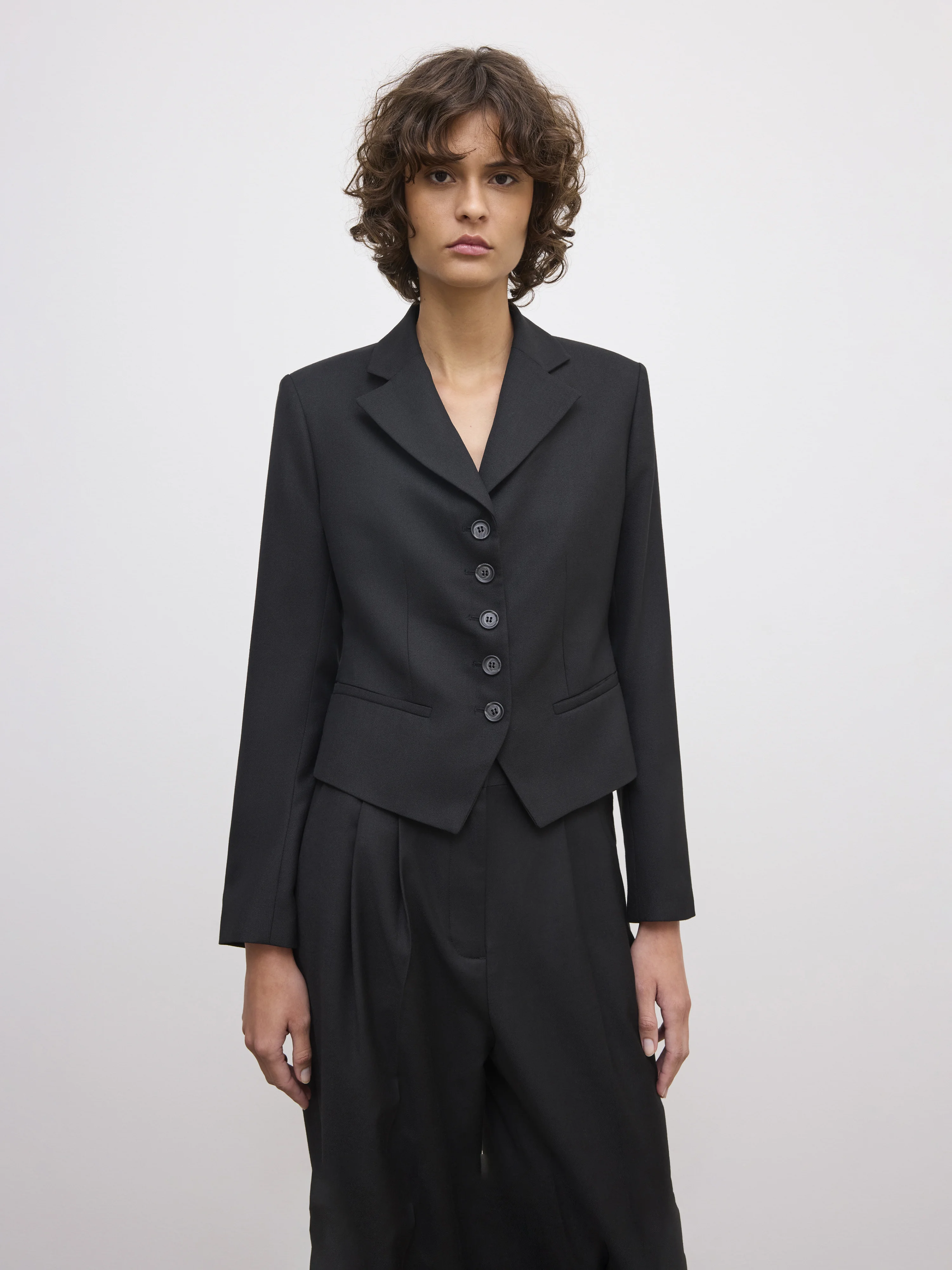 Expected arrival end of February Single-breasted short slim-fitted blazer in lightweight wool suiting, with notch lapels and front besom pockets. Designed for a close fit. Fully lined. FIT & SIZING Model is 179 cm / 5'10.5" and is wearing a size 36, UK 8, US 4 MATERIAL 50% Rec polyester 44% Virgin wool, 4% Polyester, 2% Elastane GARMENT CARE Dry clean GARMENT ORIGIN Produced in Portugal