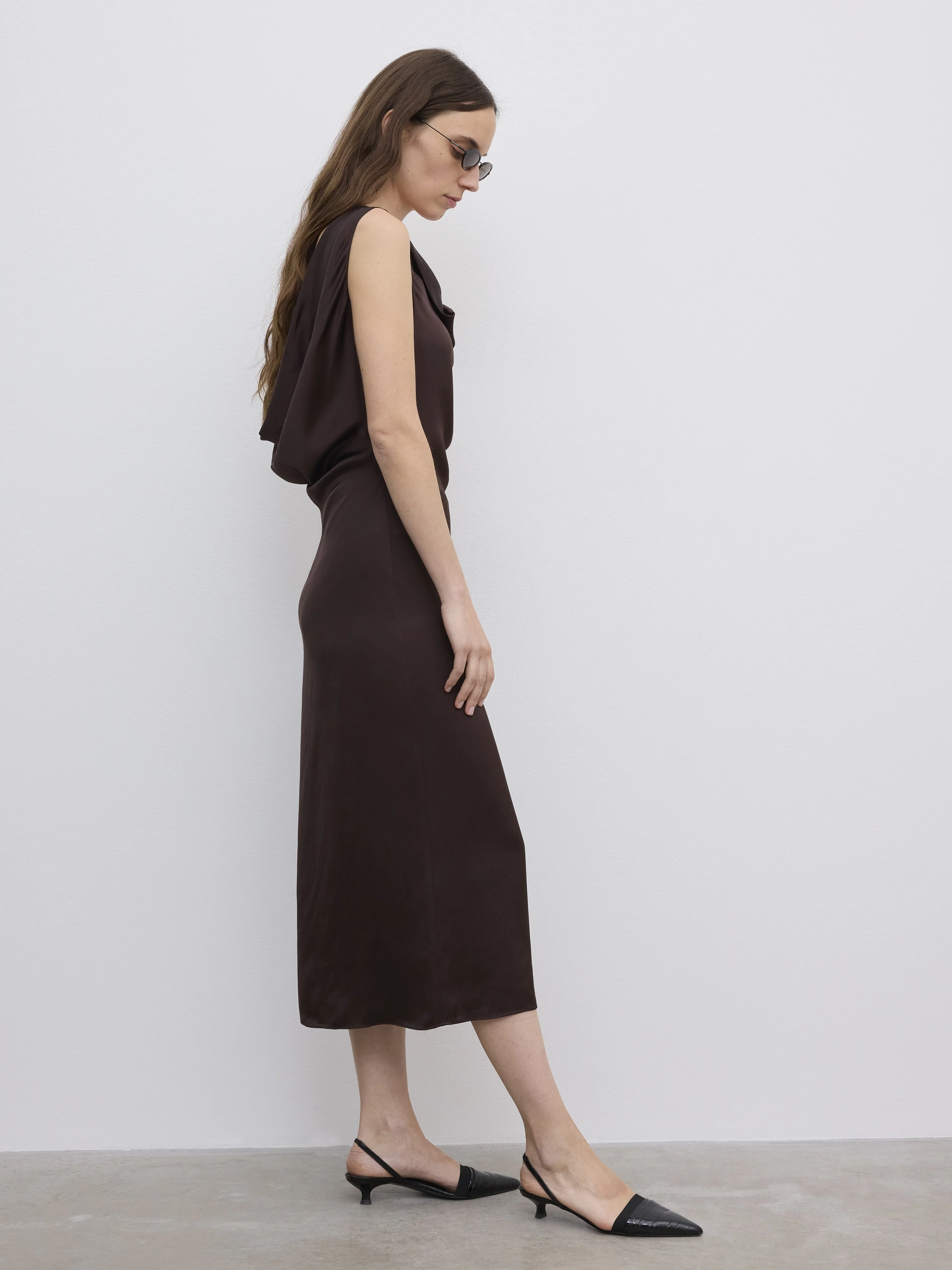 Mid-length dress in a silky Italian viscose framed by a waterfall neckline to the front and back. Body-skimming with a slight nip at the waist for a feminine silhouette. FIT & SIZING Model is 176 cm / 5'7" and is wearing a size 36, UK 8, US 4. MATERIAL 100% Viscose GARMENT CARE Handwash cold GARMENT ORIGIN Produced in Portugal