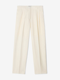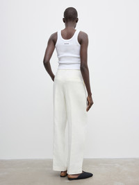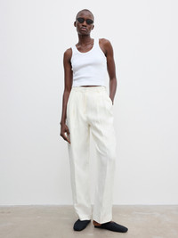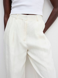 High-rise tailored trousers made from structured Italian linen. A wardrobe essential presented with a wide leg, pressed front and back centre creases, front slash pockets, and back welt pockets. FIT & SIZING Model is 178cm/ 5'8" and is wearing a size 36, UK 8, US 4. MATERIAL 100% Linen GARMENT CARE Machine wash, 30° delicate GARMENT ORIGIN Produced in Portugal