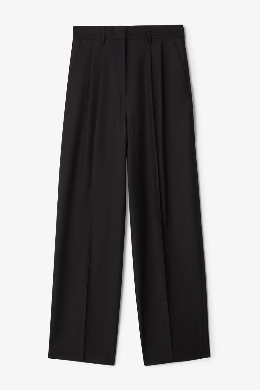 High-rise tailored trouser made from lightweight wool suiting. A wardrobe essential presented with a wide leg, pressed front and back creases, front slash pockets, and back welt pockets. - High waist - Belt loops - Side and back pockets - Zipper fly - Front and back pleats - Relaxed, wide leg FIT & SIZING Model is 175cm/ 5'7" and is wearing a size 36, UK 8, US 4. Relaxed in fit, if in between sizes we recommend choosing a smaller size in this item. Full length MATERIAL 54% Recycled polyester, 44% Virgin wool, 2% Elastane. GARMENT CARE Dry Clean Only GARMENT ORIGIN Produced in Portugal