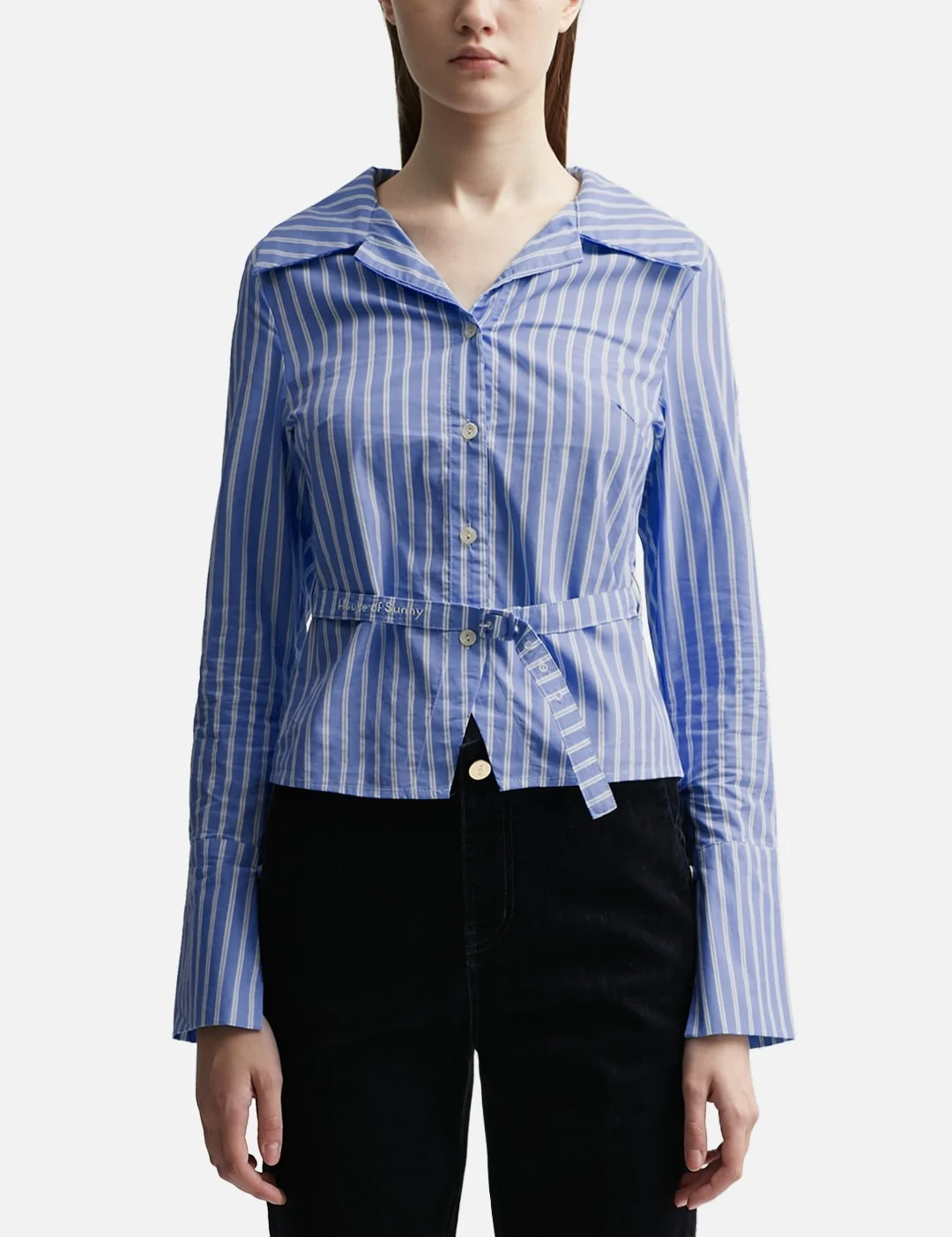 - House of Sunny - Elle Belted Shirt - Striped cotton poplin shirt - Spread collar - Button closure - Single button cuff - Rear tie closure - Short hem - Color: Multi - Material: 100% Cotton - See more Shirts and Clothing SIZING - Model wears size 6 - Model measures: Height 180cm, Chest 33’’/84cm, Waist 23’’/58.42cm, Hip 36’’/91cm