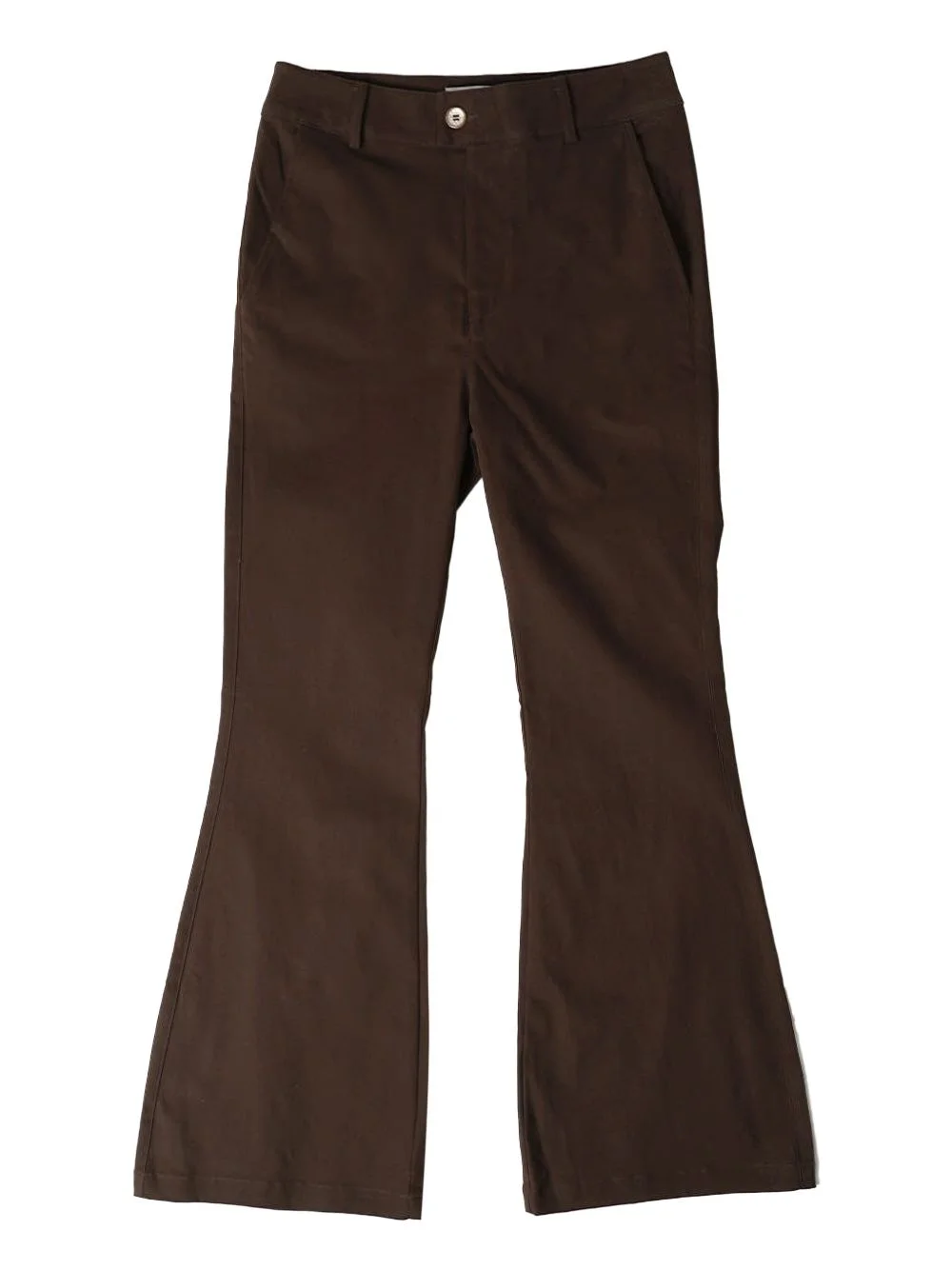 evase trousers Highlights - Brown - Two front pockets - Two back pockets - Zip fly Imported Composition Cotton 95%, Elastane 5% Washing instructions Read Manufacturer Guidelines