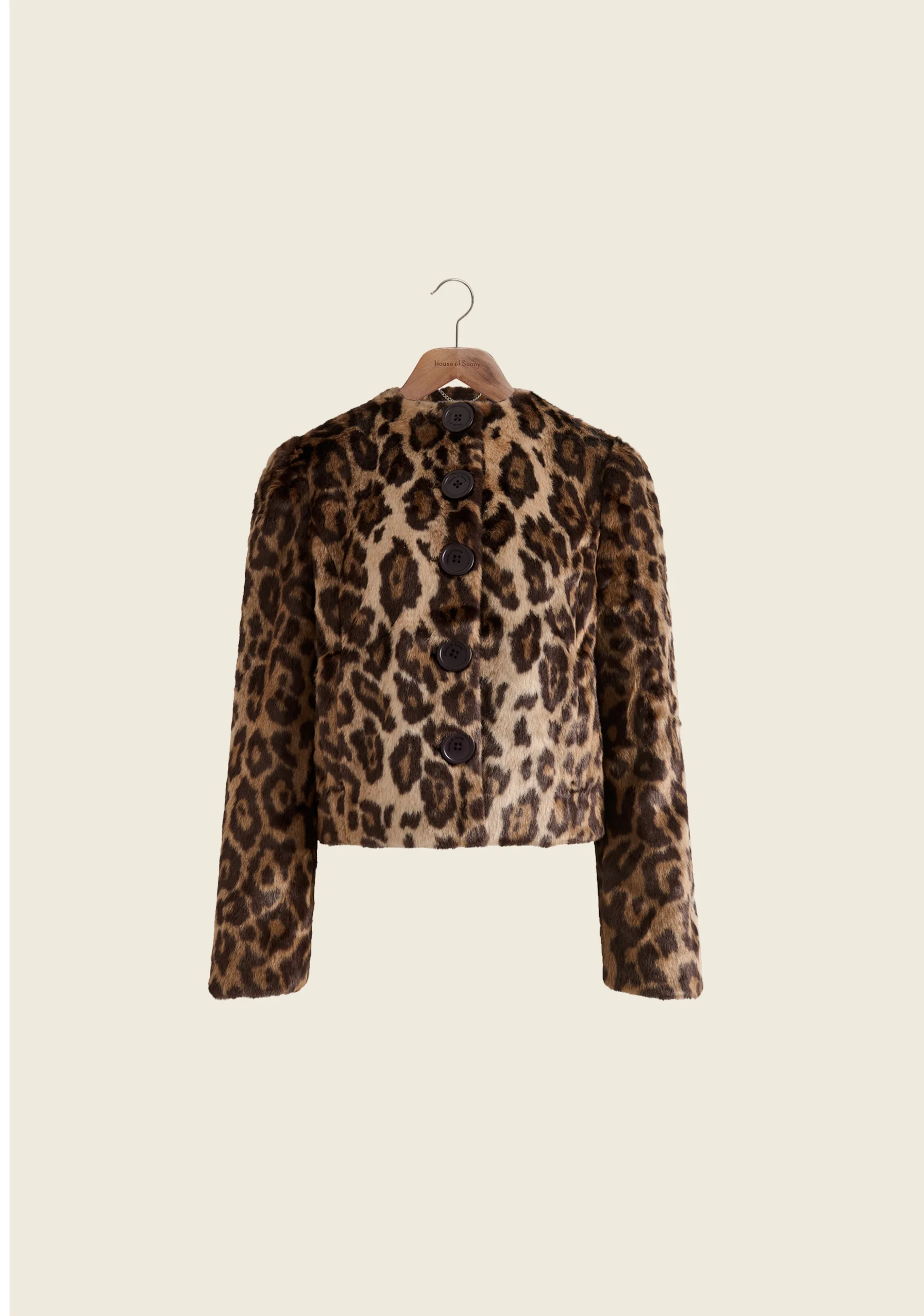 Designed for a standard fit, we recommend selecting your normal size Anna is 5'7 and wears a UK 8 Leopard print faux fur Boxy fit silhouette Metal bar with branding on the back neck Functional welt pockets Cropped fit Collarless neckline detail Complete the look with the matching 'Leopard Print Jessie Denim' FABRIC COMP SHELL: 100% MODACRYLIC. LINING: 80% POLYESTER, 20% COTTON COLOUR MULTI