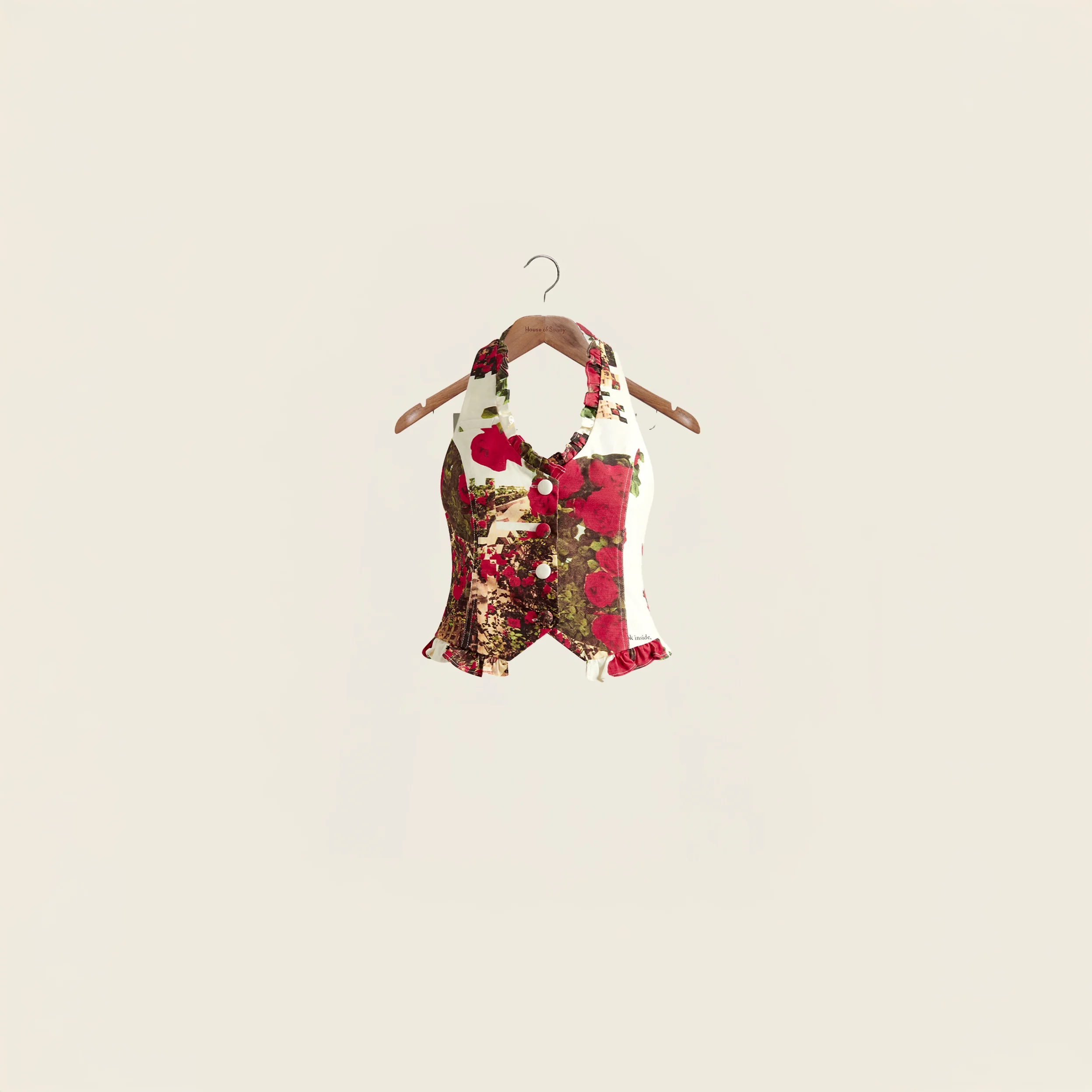 Designed for a standard fit, we recommend selecting your normal size Jess is 5'9, is a size UK 8 and wears a UK 8 Alicia is 5’7 and wears a size UK 6 Waistcoat design with a ruffled hem Thick structured canvas material Crafted with 97% Cotton Adjustable ties in the back Adjustable halter neck, with button closure Custom rose garden print all-over Lined in the custom rose print Complete the set with the matching 'THE ROSE GARDEN COTTON PANTS' FABRIC COMP 97% COTTON, 3% ELASTANE COLOUR MULTI