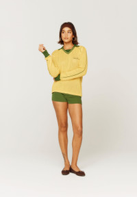 Designed for a fitted silhouette, we recommend sizing up for a more relaxed fit Robyn is 5'9 and wears a size Medium Our best selling Keepers Knit in a new colour-way 2 tone yellow & green Football inspired shirt 100% Cotton Contrast collar Open knit weave fabric HoS embroidered logo on the chest Classic football collar Breathable fabric Available in other colour-ways here FABRIC COMP 100% COTTON