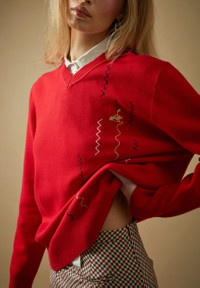 Ueda is 5'11 and wears a size S Relaxed V‑neck knit top Textured open knit pattern Ribbed cuffs and hem FABRIC COMP 82% COTTON, 18% POLYAMIDE Hand wash the garment, turning it inside out before washing. Do not tumble dry, and lay flat to dry. Iron on low heat if necessary, and avoid using bleach. For best results, professional cleaning is recommended. COLOUR TOMATO