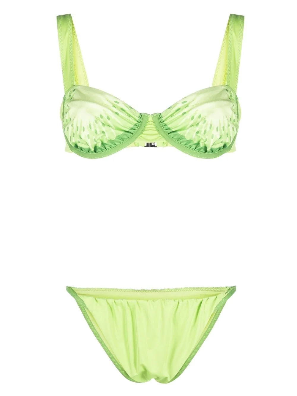 Presse bikini set Highlights - Light green - Recycled polyester blend - Ruched detailing - Underwire cup - Graphic print to the front - Sweetheart neck - Sleeveless - Clasp fastening - High-waisted bottoms - Be mindful to try on swimwear over your own garments. Imported Composition Outer: Recycled Polyester 80%, Spandex/Elastane 20% Lining: Recycled Polyester 92%, Spandex/Elastane 8%