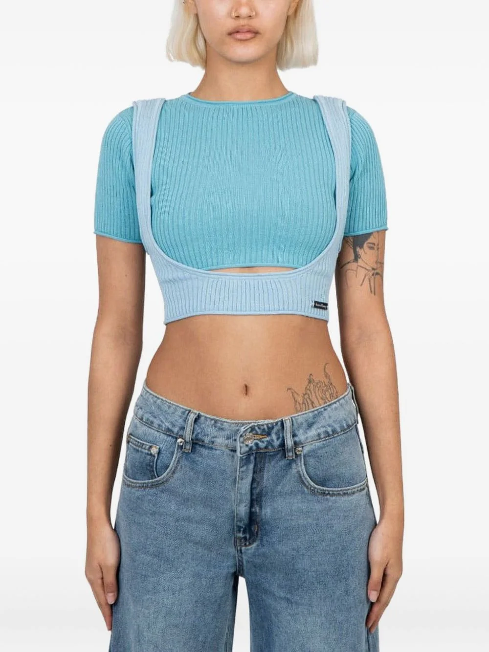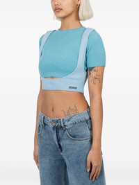 ribbed-knit cut-out top Highlights - Light blue - Ribbed knit - Cut-out detail - Short sleeves - Sleeveless top layer - Branded label Imported Composition Polyester 100% Washing instructions Read Manufacturer Guidelines