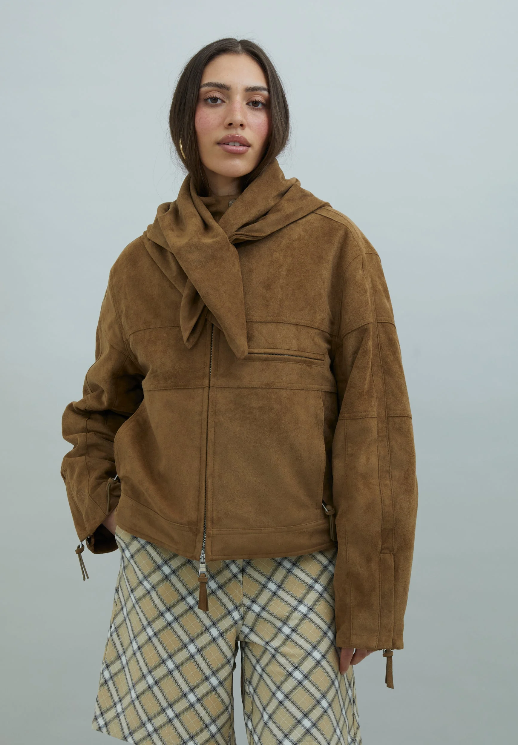 Lara is 5'9 and wears a size S Faux suede jacket with signature panel detailing Adjustable side buckles and double-zip fastening Embroidered logo Boxy, relaxed fit Zips at the cuff Additional scarf accessory with embossed logo finishing FABRIC COMP SHELL: 100% POLYESTER. LINING: 80% POLYESTER, 20% COTTON. FILLING: 100% POLYESTER Do not wash, tumble dry, iron, dry clean, or bleach. Clean only by wiping with a damp cloth or sponge. COLOUR BROWN