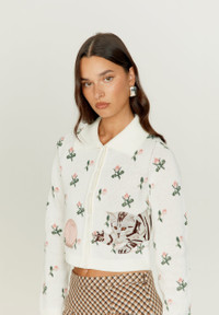 Designed for a standard fit, we recommend selecting your normal size Classic House of Sunny silhouette British shorthair cat design Embroidered HoS logo detailing Cropped fit Button fastening Embroidered top note details Updated with cotton for breathability FABRIC COMP 50.5% COTTON, 49.5% ACRYLIC COLOUR MILK