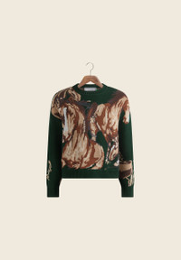 Klaudia is 5'10 and wears a size M Best selling picture knit motif Ribbed knit hem Custom HOS colour palette Crew neck fit Jacquard horse knit motif FABRIC COMP 52% COTTON, 48% ACRYLIC COLOUR EMERALD GREEN