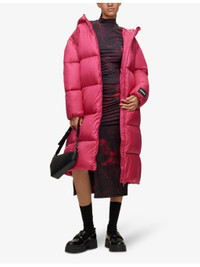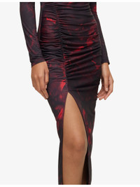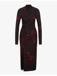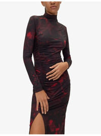PRODUCT DETAILS - HUGO stretch-recycled polyester midi dress - 86% recycled polyester, 14% elastane - Slips on - Slim fit, high neck, long sleeves, all-over abstract print, ruched front, slit to the front, midi length - Machine wash cold - True to size - Model is 5ft 9in/1.75m and wears a size small - Lightweight, stretchy Ref: R04225389