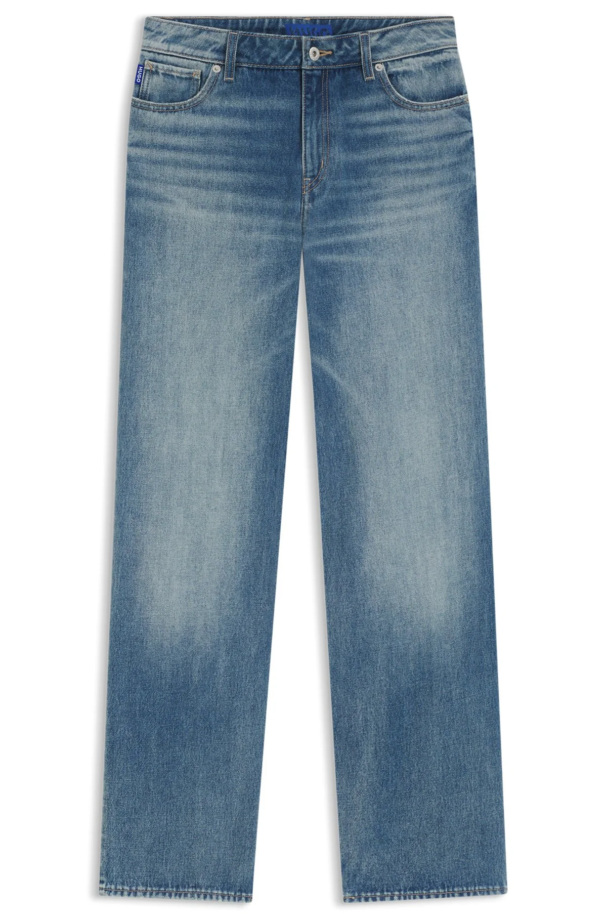 SIZE AND FIT The model wears a size 27/32 and is 5'8" tall with a, 29" chest, 22" waist and 34" hips. DETAILS Gamala_B - 50541539 With a Happy HUGO heart print, these baggy-fit HUGO Womenswear jeans are brimming with modern appeal. Rigid blue denim with authentic used effects. baggy fit Mid rise Button and zip closure Pockets bottom front: Ticket pocket Wide leg Pockets bottom back: Patch pocket QUALITY & CARE INSTRUCTIONS Do Not Tumble Dry Machine Wash Cold Gentle Quality: 100% Cotton, pocketing: 100% Cotton Iron Medium Heat Do Not Bleach Do Not Dry Clean