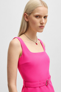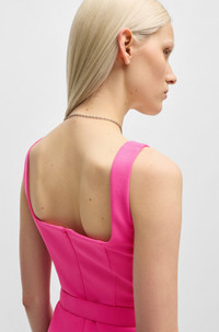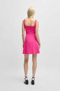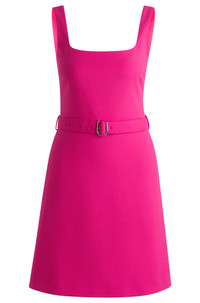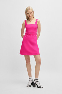 SIZE AND FIT The model wears a size 2 and is 5'10" tall with a, 32" chest, 24" waist and 35" hips. DETAILS Kamena - 50537631 With a neat rear zip, this HUGO Womenswear dress has a modern flirty silhouette. Belt with branded buckle accentuates the waist. Regular fit Fastening top: Concealed closure Sleeveless No cuffs No vent Fully lined Fit back length: 89 cm (35 inches) QUALITY & CARE INSTRUCTIONS Reduced Dry Clean Do Not Bleach Cold, gentle machine wash; reduced spin speed. Do Not Tumble Dry Iron Low Heat Quality: 64% Polyester, 31% Viscose, 5% Elastane, Lining: 100% Polyester