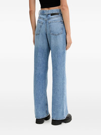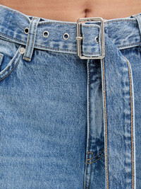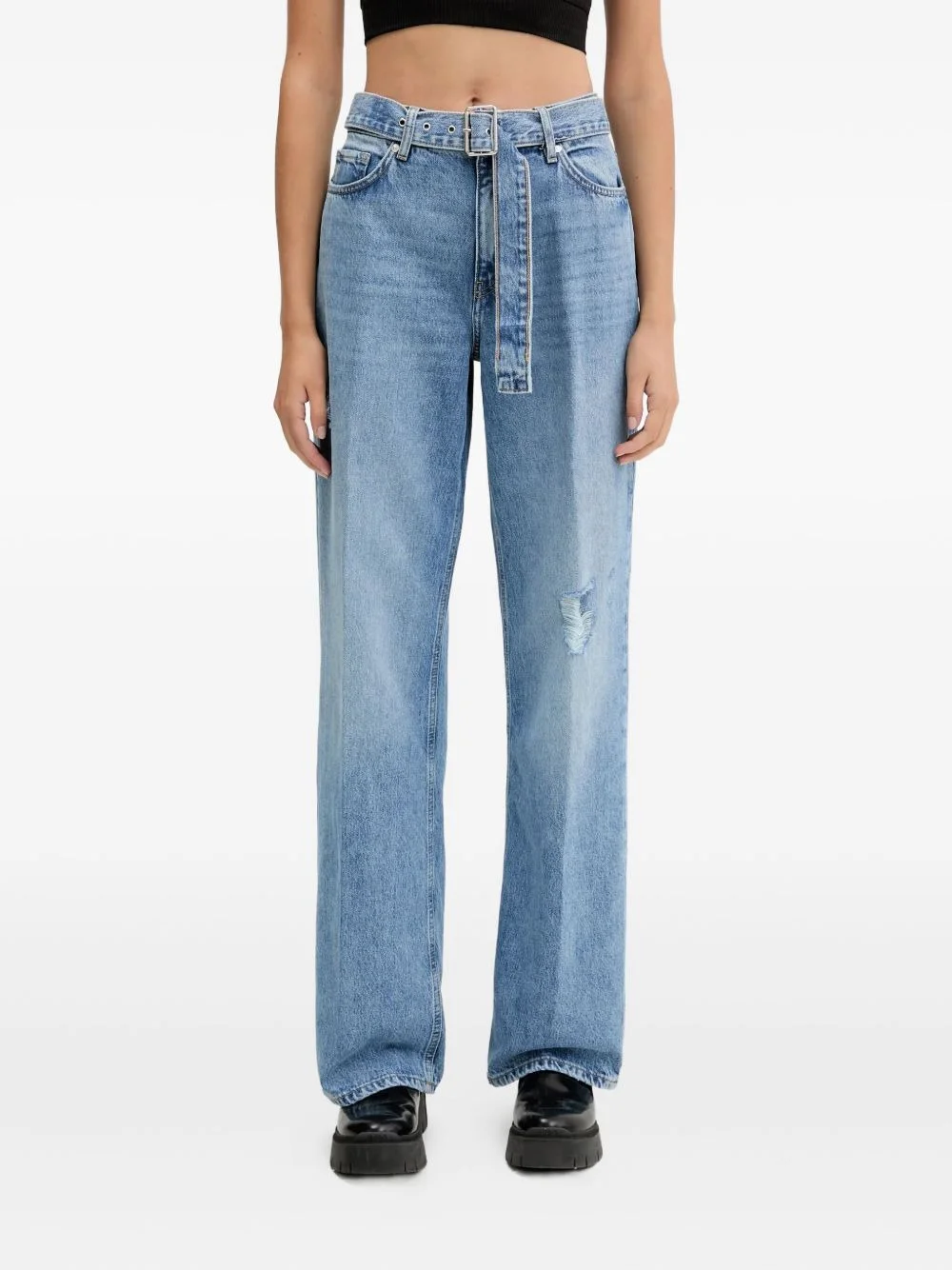 belted jeans Highlights - Blue - Belted waist - Silver-tone buckle - Distressed detail - Five-pocket styling Imported Composition Cotton 100% Washing instructions Read Manufacturer Guidelines