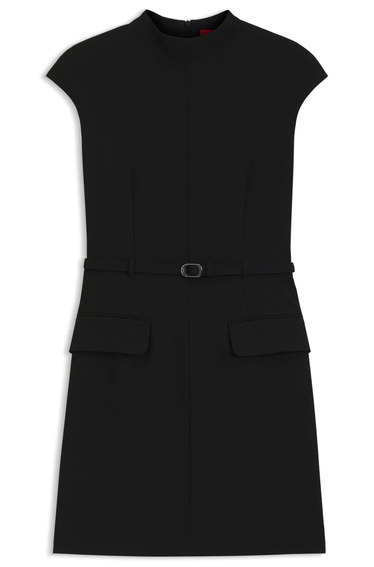 SIZE AND FIT The model wears a size 4 and is 0'0" tall with a, 30" chest, 23" waist and 33" hips. DETAILS Kalunia - 50545545 With a buckled belt and light shoulder padding, this HUGO Womenswear dress strikes a modern silhouette. Cut in stretch fabric with a high neckline. Regular fit Neckline: Mock Neck Fastening top: Concealed closure Cap sleeves No cuffs Pockets top: Flap pockets No vent Fully lined Fit back length: 87 cm (34 inches) QUALITY & CARE INSTRUCTIONS Reduced Dry Clean Do Not Bleach Do Not Tumble Dry Quality: 64% Polyester, 31% Viscose, 5% Elastane, Lining: 100% Polyester Iron Low Heat Machine Wash Cold Gentle