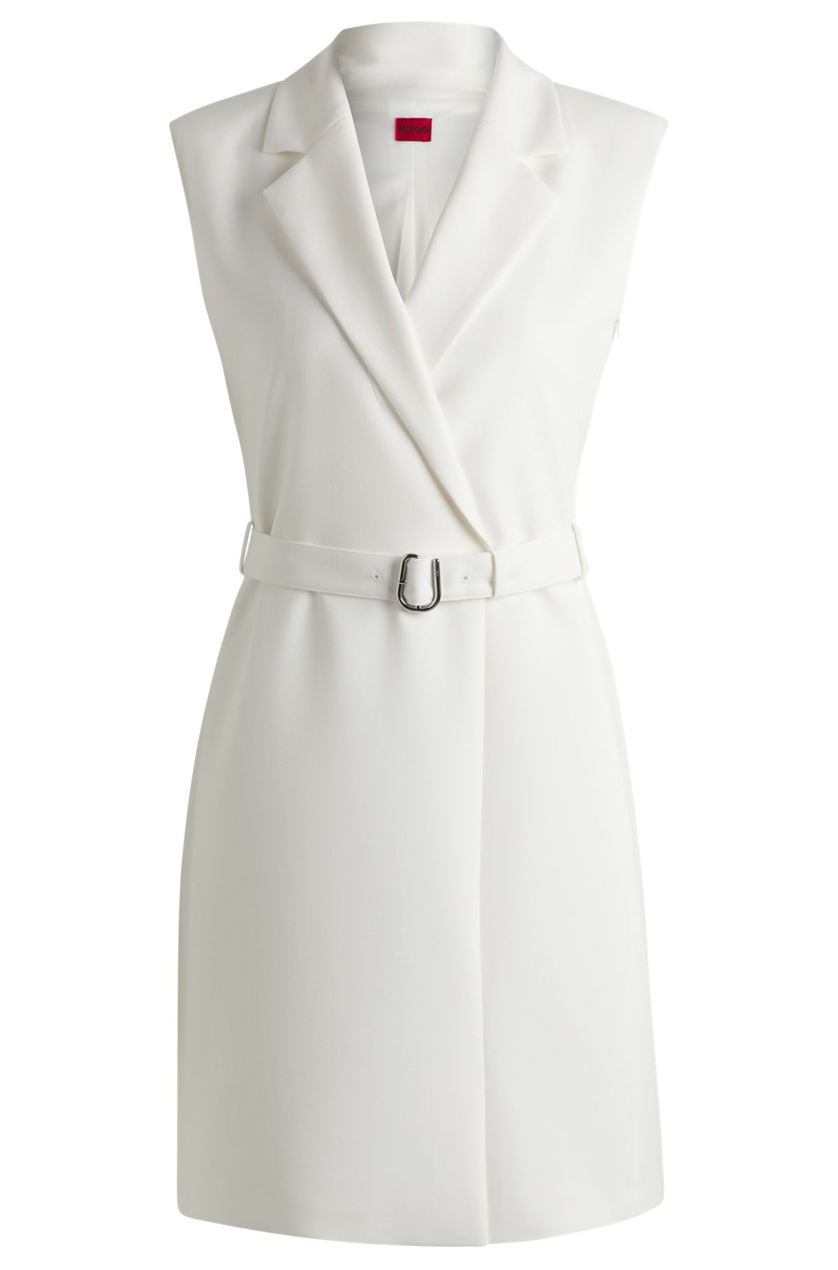 SIZE AND FIT The model wears a size 2 and is 5'10" tall with a, 32" chest, 24" waist and 35" hips. DETAILS Komea - 50537609 With a waist-cinching belt, this blazer-inspired HUGO Womenswear dress is so easy to style. Stretch material for comfort. Neat side-seam zip. Regular fit Fastening top: Concealed closure Sleeveless No cuffs Front vent Fully lined Fit back length: 90 cm (35 inches) QUALITY & CARE INSTRUCTIONS Reduced Dry Clean Do Not Bleach Cold, gentle machine wash; reduced spin speed. Do Not Tumble Dry Iron Low Heat Quality: 64% Polyester, 31% Viscose, 5% Elastane, Lining: 100% Polyester