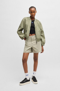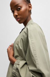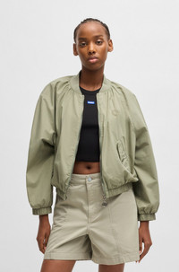 SIZE AND FIT The model wears a size 4 and is 5'8" tall with a, 31" chest, 23" waist and 34" hips. DETAILS Asata-1-D_B - 50536970 With a bomber collar and patch pockets, this HUGO Womenswear jacket is handy in the summer. Elasticated waist and embroidered Happy HUGO logo. QUALITY & CARE INSTRUCTIONS Reduced Dry Clean Machine Wash Cold Gentle Do Not Tumble Dry Iron Low Heat Quality: 100% Cotton, Lining: 100% Polyester, pocketing: 100% Cotton Do Not Bleach
