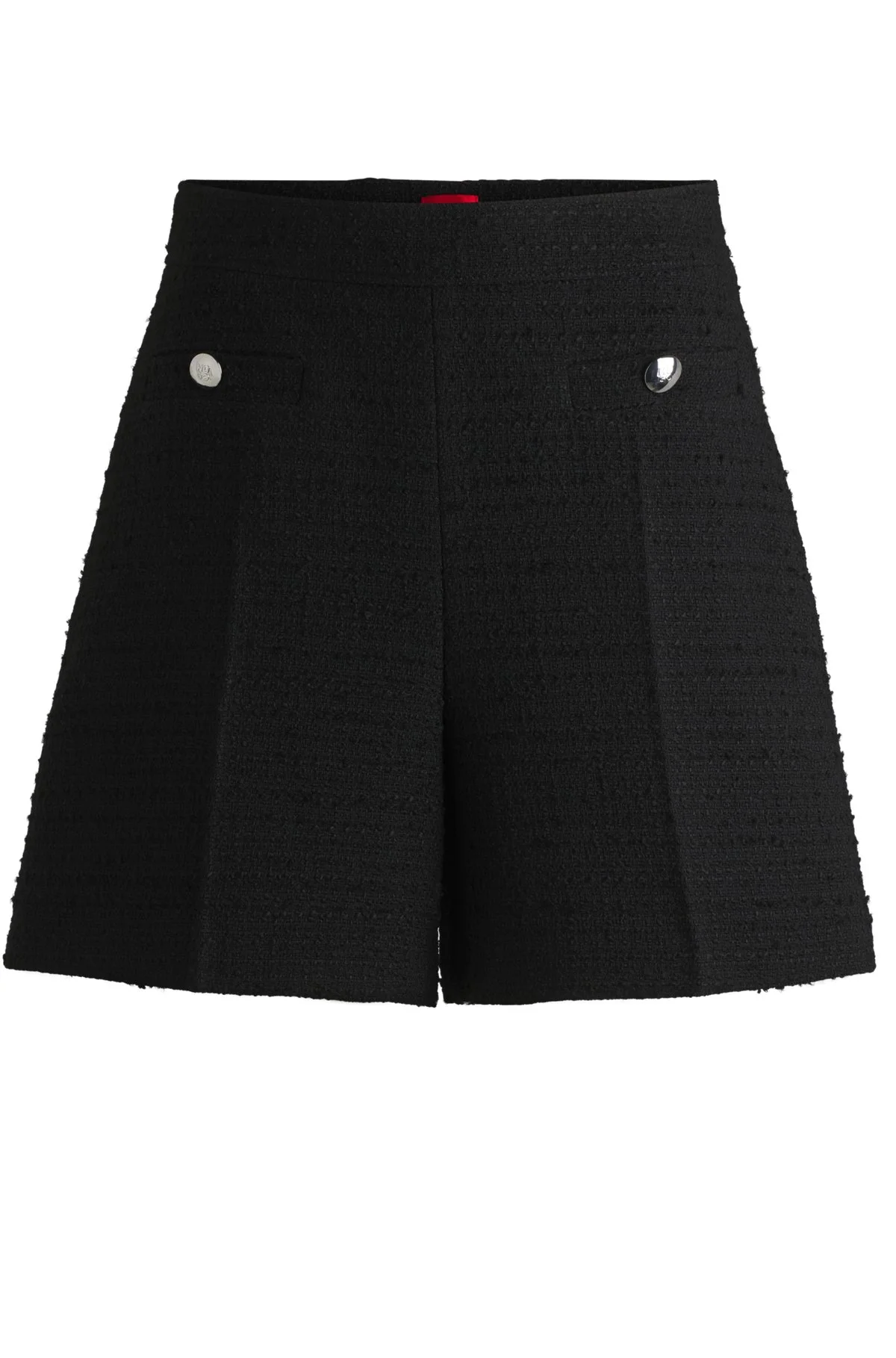 SIZE AND FIT The model wears a size 4 and is 5'9" tall with a, 30" chest, 23" waist and 34" hips. DETAILS Haberi-1 - 50537635 With a 60s-inspired design, these HUGO Womenswear shorts are a must this season. Textured boucle fabric offset by polished shank buttons featuring stacked logos. Regular rise Zip closure QUALITY & CARE INSTRUCTIONS Do Not Iron Reduced Dry Clean Do Not Bleach Cold, gentle machine wash; reduced spin speed. Do Not Tumble Dry Quality: 74% Polyacrylic, 21% Polyester, 5% Other fibres, pocketing: 100% Cotton