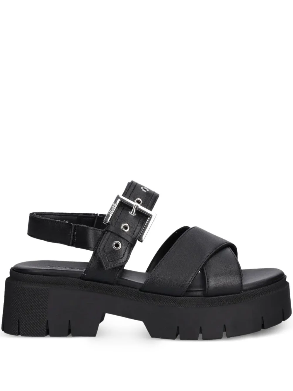 buckle-strap sandals Highlights - Black - Buckle-strap fastening - Crossover strap at the toe - Low block heel - Chunky rubber sole Imported Composition Outer: Calf Leather 100%, Polyester 60%, Polyurethane 40% Lining: Polyester 60%, Polyurethane 40% Sole: Thermoplastic Elastomers (TPE) 100%