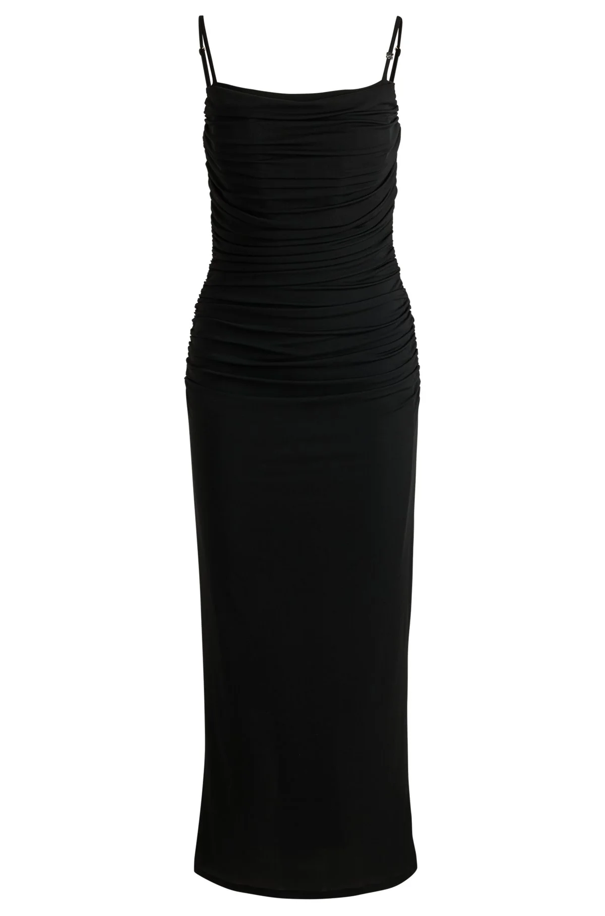 SIZE AND FIT The model wears a size M and is 5'10" tall with a, 33" chest, 23" waist and 35" hips. DETAILS Noffiano - 50540915 In draped mesh with a supportive corset underneath, this HUGO Womenswear dress has a flattering midi-length silhouette. Slender straps with stacked-logo charm. Slim fit Sleeveless QUALITY & CARE INSTRUCTIONS Do Not Dry Clean Quality: 86% Polyester, 14% Elastane, Lining: 67% Polyamid, 33% Elastane Iron Low Heat Do Not Bleach Do Not Tumble Dry Machine Wash Cold Gentle