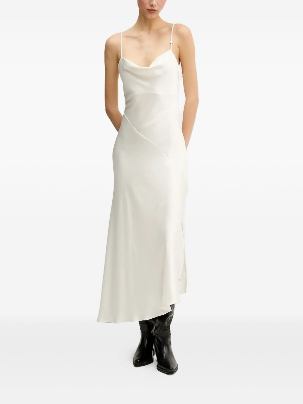 cowl-neck asymmetric maxi dress Highlights - White - Cowl neck - Asymmetric hem - Spaghetti straps - Strap detail - Side split Imported Composition Lining: Viscose 100% Outer: Polyester 51%, Recycled Polyester 49% Washing instructions Read Manufacturer Guidelines