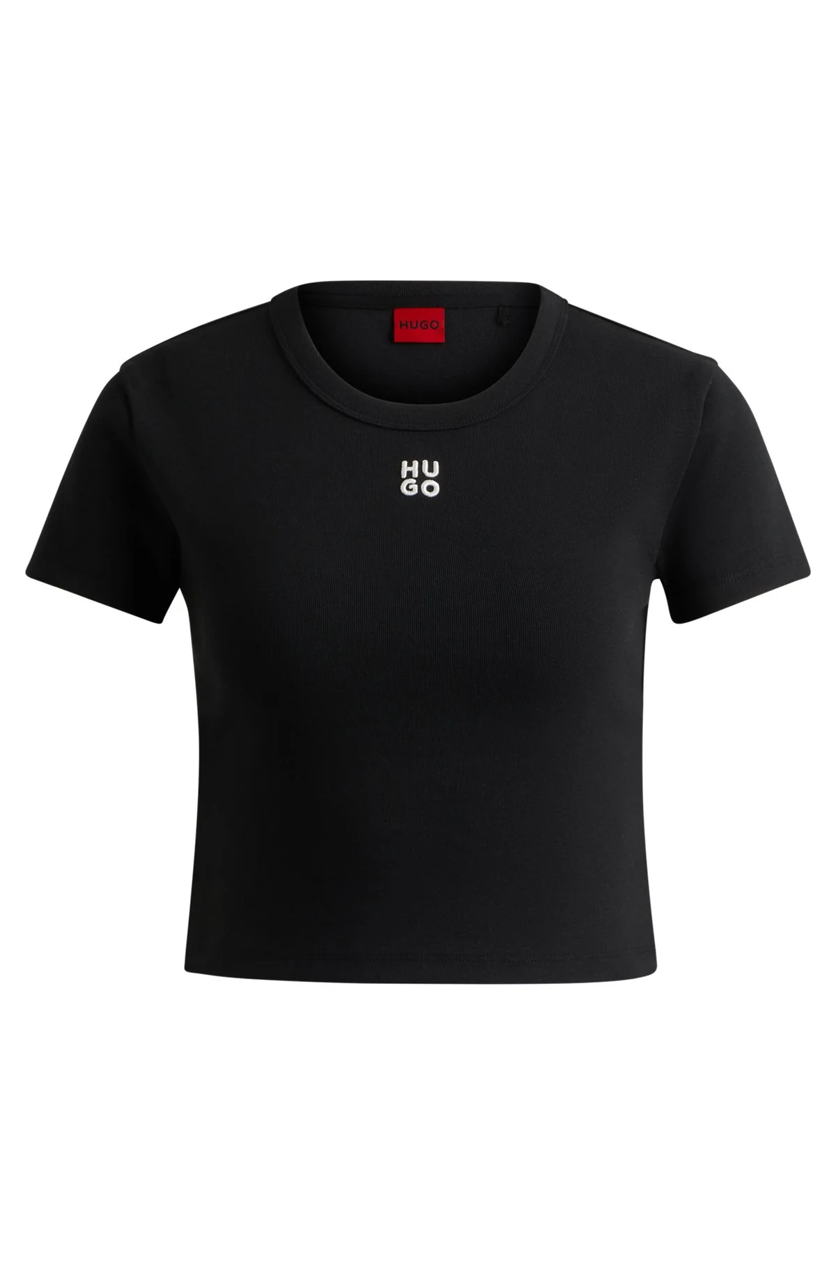 SIZE AND FIT The model wears a size S and is 5'8" tall with a, 31" chest, 23" waist and 34" hips. DETAILS Delanor - 50512000 A slim-fitting T-shirt crafted in stretch ribbed material with an embroidered stacked logo at the chest by HUGO Womenswear. Slim fit Neckline: Crew neck Short sleeves Short length QUALITY & CARE INSTRUCTIONS Do Not Tumble Dry Quality: 66% Cotton, 29% Polyester, 5% Elastane Do Not Bleach Machine Wash Cold Gentle Iron Low Heat Reduced Dry Clean