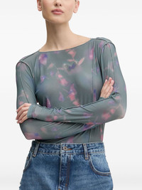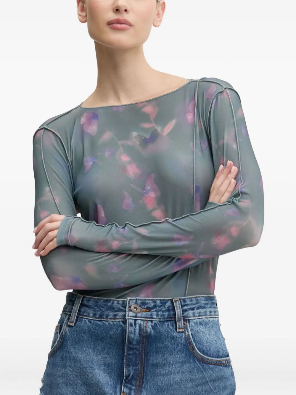 floral-print mesh t-shirt Highlights - Green - Mesh fabric - Butterfly floral print - Long sleeves - Round neck - Seam detail Imported Composition Polyester 87%, Elastane 13% SIZE & FIT Measurement LENGTH 21.65 in(55 cm) SLEEVE LENGTH 24.8 in(63 cm) Washing instructions Read Manufacturer Guidelines