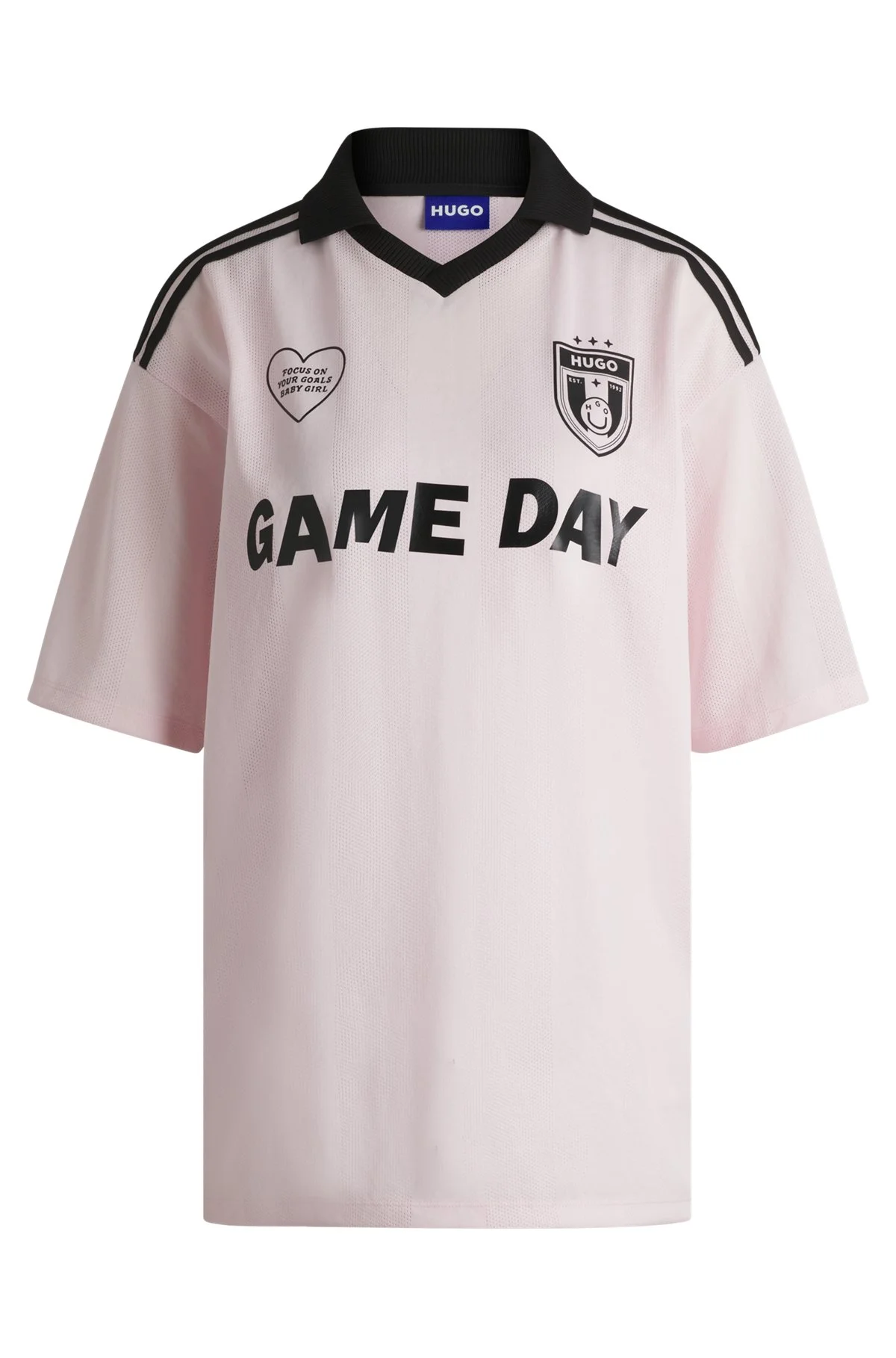 SIZE AND FIT The model wears a size S and is 5'8" tall with a, 31" chest, 23" waist and 34" hips. DETAILS Dila_B - 50537456 In mesh for airflow, this relaxed-fit HUGO Womenswear T-shirt features artwork including the Happy HUGO logo. With football-inspired prints and a collar. QUALITY & CARE INSTRUCTIONS Quality: 100% Polyester Do Not Tumble Dry Do Not Bleach Machine Wash Cold Gentle Iron Low Heat Do Not Dry Clean