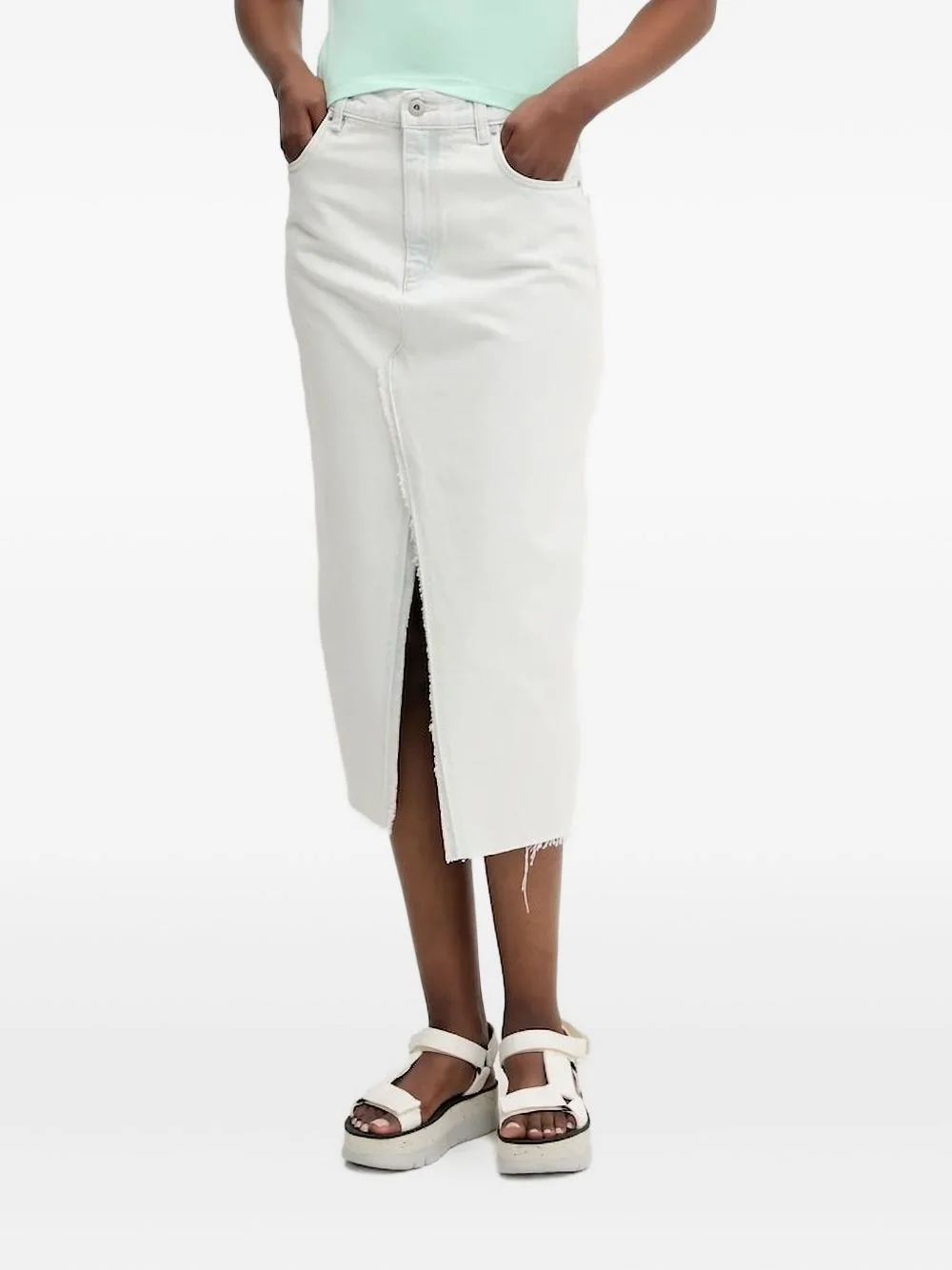 front-slit denim skirt Highlights - Off-white - Denim - Front slit - Frayed edge - High waist - Back logo patch Imported Composition Cotton 100% Washing instructions Read Manufacturer Guidelines