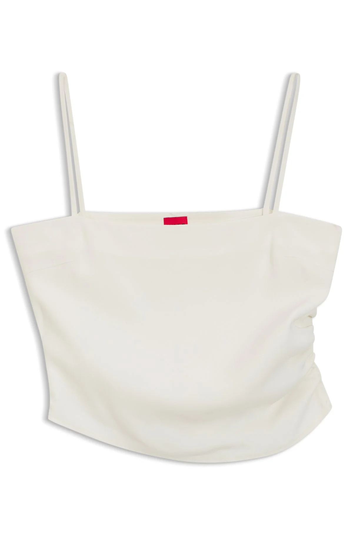 SIZE AND FIT Slim fit The model wears a size 4 and is 5'10" tall with a, 33" chest, 23" waist and 34" hips. DETAILS In a slim-cut bandeau style, this HUGO Womenswear top has slender straps and flattering gatherings. Soft stretch crepe. Hidden seam zip. Slim fit Fastening top: Concealed closure Sleeveless Fully lined Fit back length: 48 cm (19 inches) Cabivea - 50559167 QUALITY & CARE INSTRUCTIONS Iron Low Heat Material: 84% Viscose, 12% Polyester, 4% Elastane, Lining: 100% Polyester Do Not Tumble Dry Reduced Dry Clean Do Not Bleach Do Not Wash