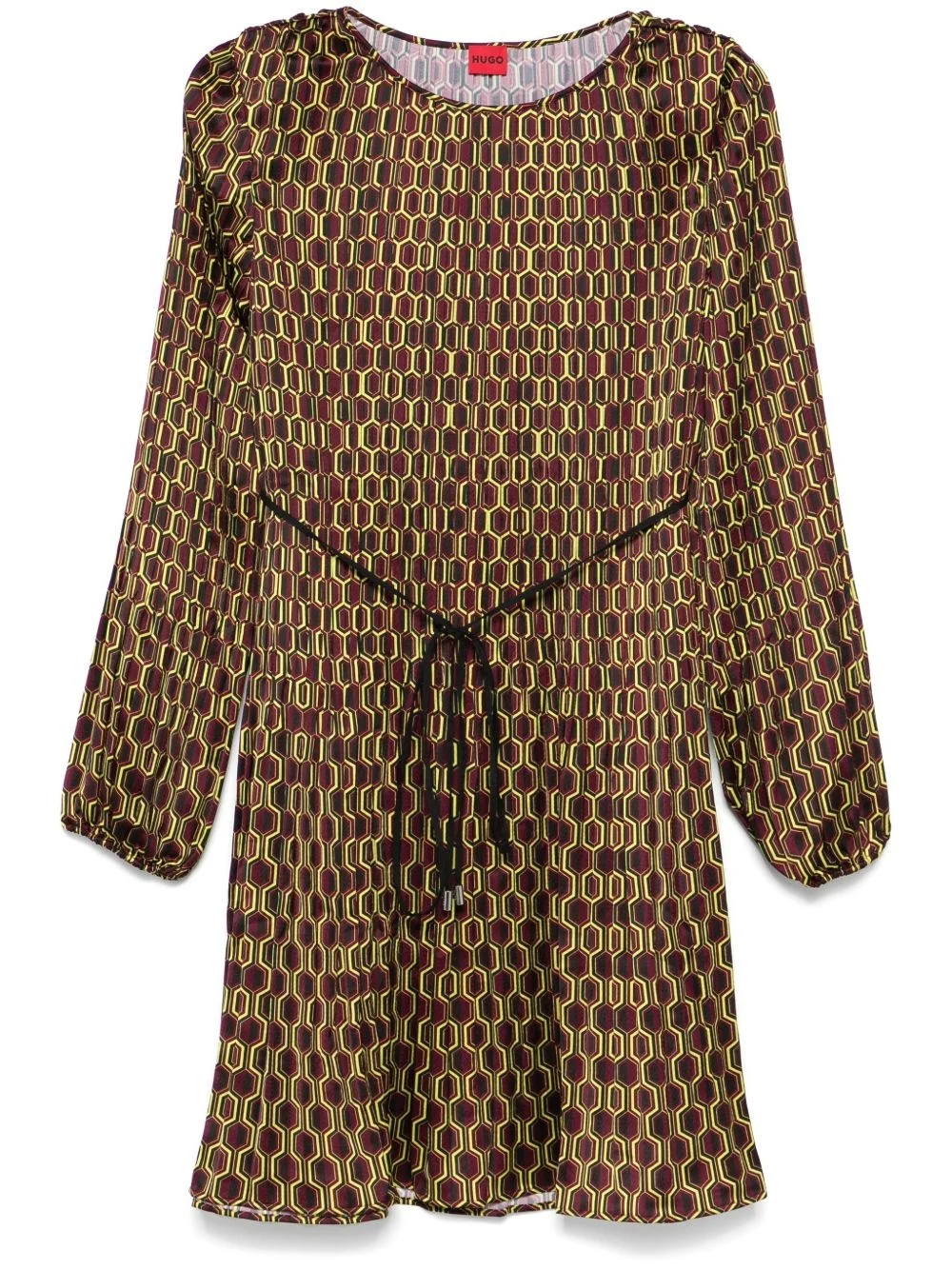 geometric-print pleated dress Highlights - Bordeaux red/multicolour - Fully pleated - Geometric print - Crew neck - Long puff sleeves - Detachable waist belt - Unlined - Flared Imported Composition Polyester 100%
