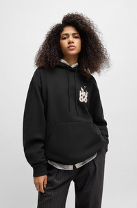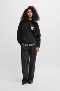 SIZE AND FIT The model wears a size S and is 5'9" tall with a, 30" chest, 23" waist and 34" hips. DETAILS Dejandra - 50534047 A signature hoodie by HUGO Womenswear, detailed with graphics at the front and back. This top is cut to a relaxed fit in cotton terry. Relaxed fit Neckline: Hooded Pockets top: Kangaroo pocket Long sleeves Ribbed cuffs Long length QUALITY & CARE INSTRUCTIONS Iron Low Heat Machine Wash Cold Gentle Quality: 100% Cotton Do Not Bleach Do Not Tumble Dry Do Not Dry Clean