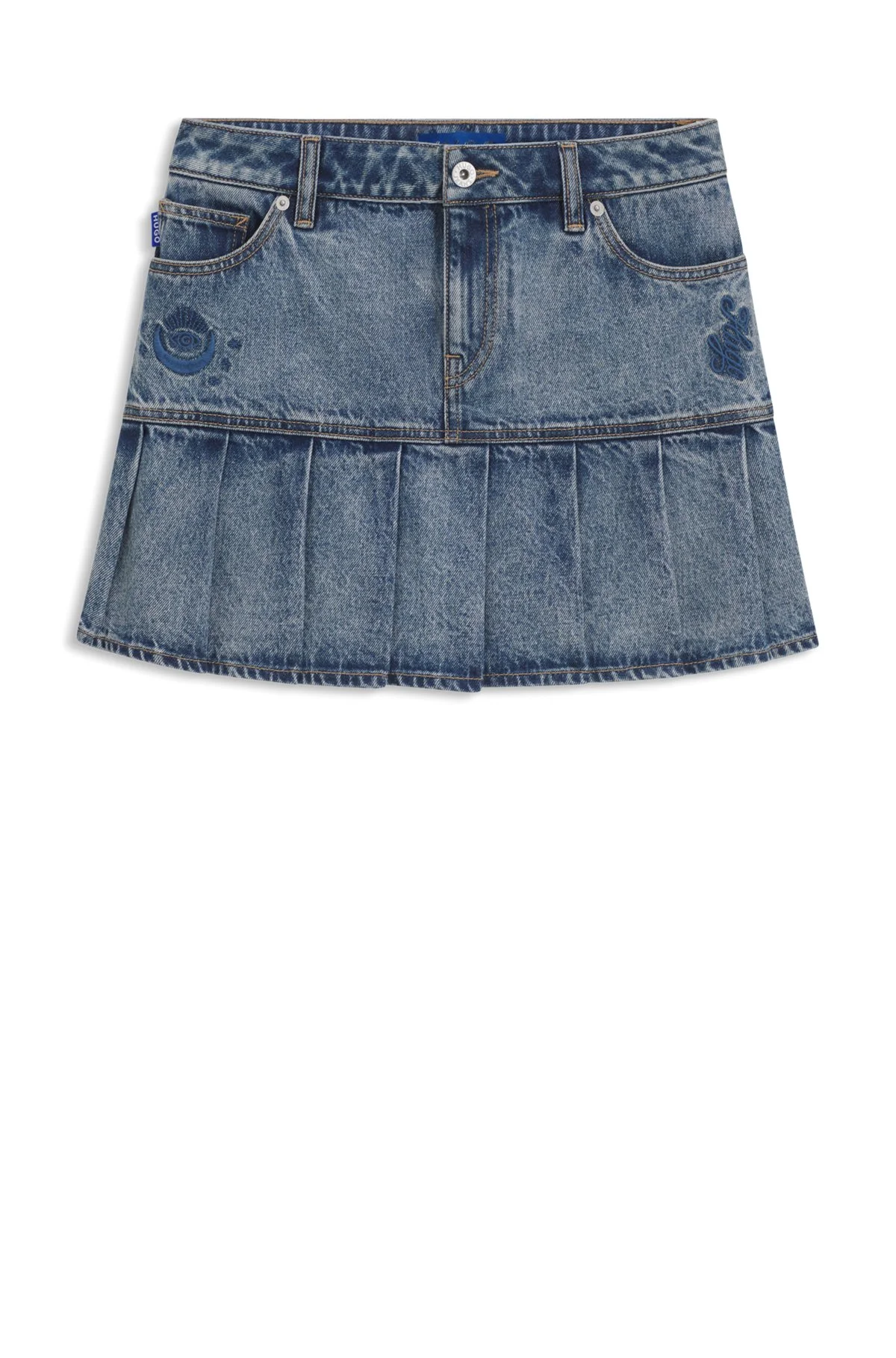 SIZE AND FIT The model wears a size S and is 5'8" tall with a, 31" chest, 23" waist and 34" hips. DETAILS Washed to an authentic blue with embroidered motifs, this HUGO Womenswear mini skirt is made in rigid cotton denim. Half pleats for a modern silhouette. Regular rise Button and zip closure Pockets bottom front: Side pockets Short length Gaby_B - 50546318 QUALITY & CARE INSTRUCTIONS Machine Wash Cold Gentle Do Not Bleach Do Not Dry Clean Do Not Tumble Dry Quality: 100% Cotton, pocketing: 100% Cotton Iron Medium Heat