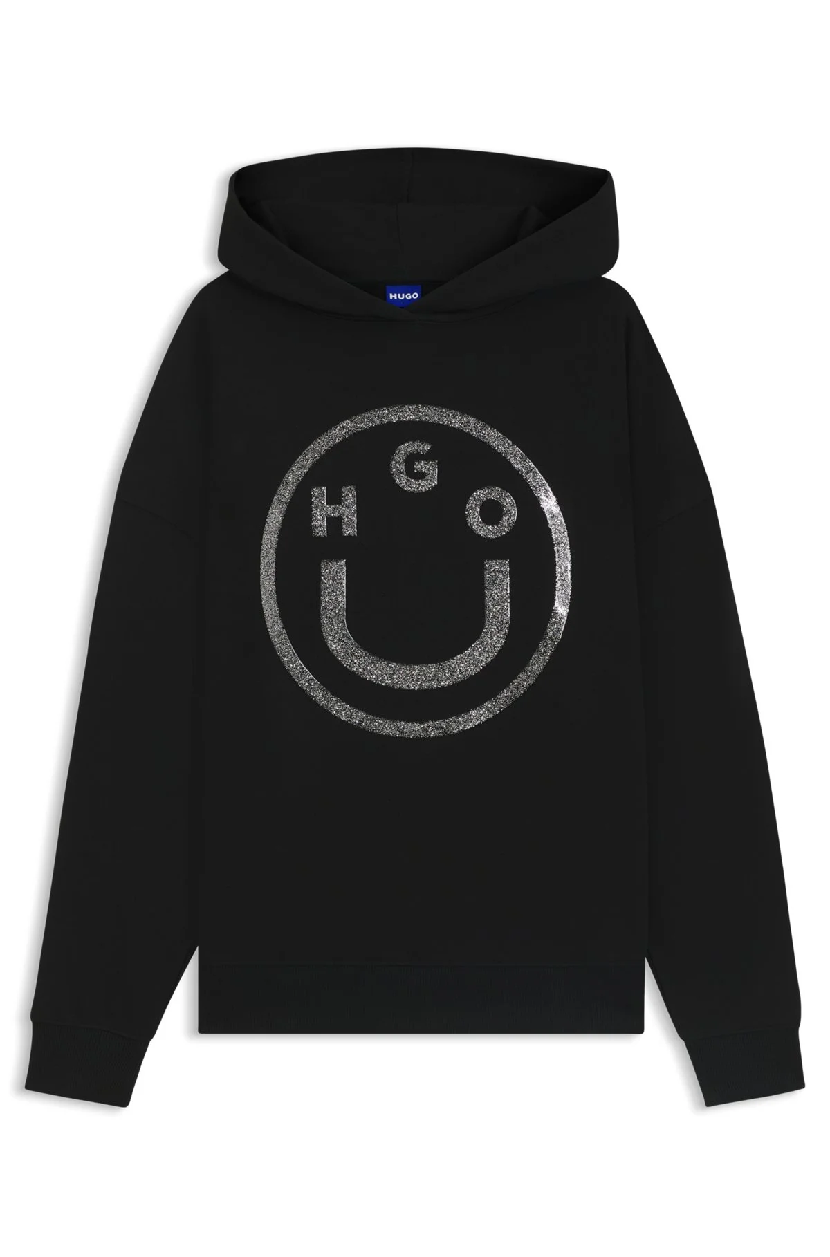 SIZE AND FIT The model wears a size S and is 5'10" tall with a, 30" chest, 23" waist and 33" hips. DETAILS Printed with a glittery Happy HUGO logo, this relaxed-fit HUGO Womenswear hoodie brings playful character to casual looks. Soft French-terry cotton. Relaxed fit Neckline: Hooded Dolasa_B_2 - 50550709 QUALITY & CARE INSTRUCTIONS Do Not Bleach Material: 100% Cotton Do Not Tumble Dry Machine Wash Cold Gentle Do Not Dry Clean Iron Low Heat